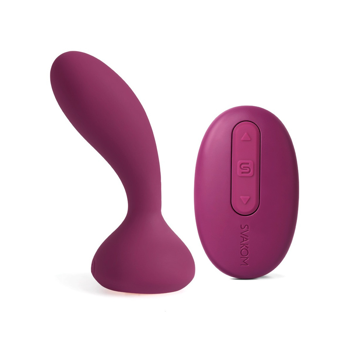 Plug anale ergonomicamente curvo per un massaggio alla prostata infallibile. Adatto anche per la stimolazione intensiva del punto G. Viziatori con 5 potenti modalità di vibrazione in 5 intensità ciascuno. L'ulteriore modalità intelligente SVAKOM imita le frequenze di vibrazione del rapporto sessuale fino all'orgasmo. Comodamente controllabile con la semplice pressione di un tasto o con il telecomando. Ricaricabile con il cavo di ricarica USB incluso. Compreso sacchetto di stoccaggio e batterie per il telecomando.