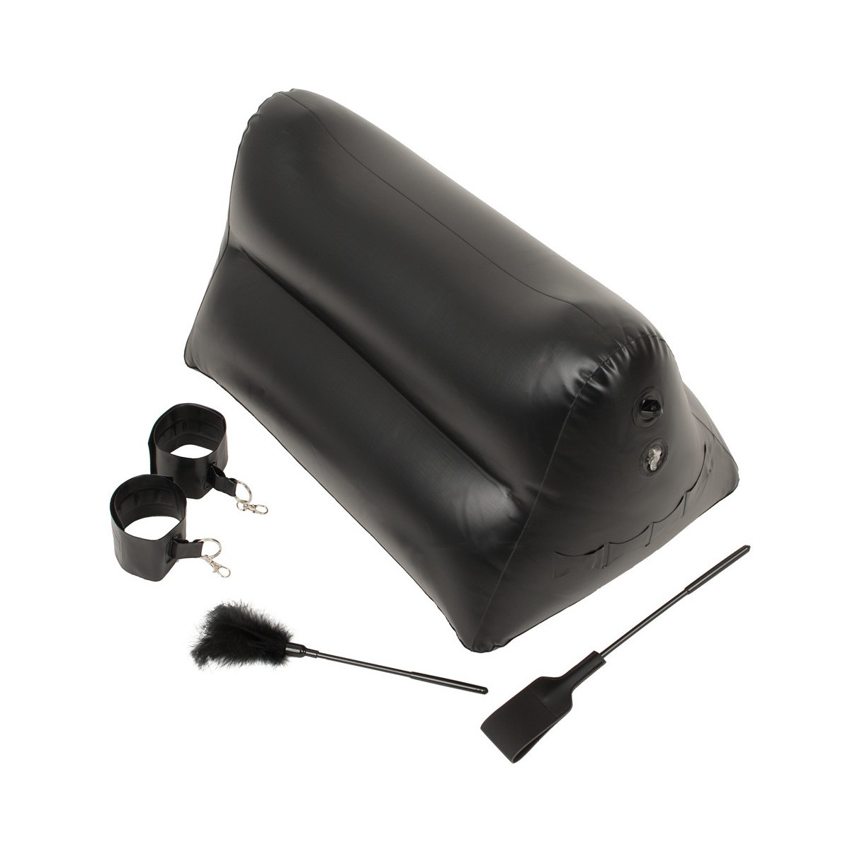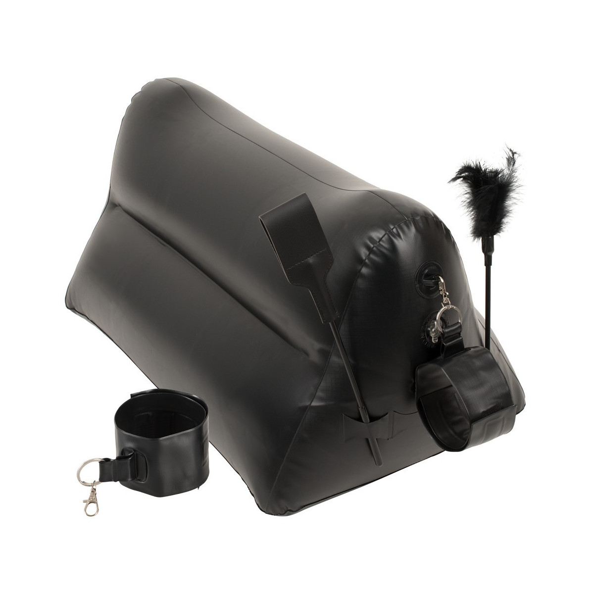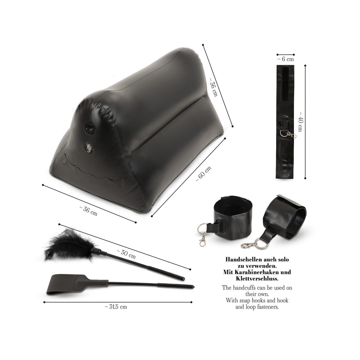 Questo cuscino dell'amore è perfetto per tutte le coppie che vogliono sperimentare nuove posizioni o un bondage leggero. Si gonfia rapidamente e può essere usato in molte posizioni per un divertimento sessuale condiviso. Su ogni lato offre la possibilità di attaccare le manette incluse tramite un moschettone. In combinazione con il paddle incluso e l'asta a molla vi invita a eccitanti giochi di bondage o sessioni di sculacciate. E se nella foga del momento dovesse apparire un piccolo buco, questo viene richiuso rapidamente con i 2 cerotti di riparazione e la colla.