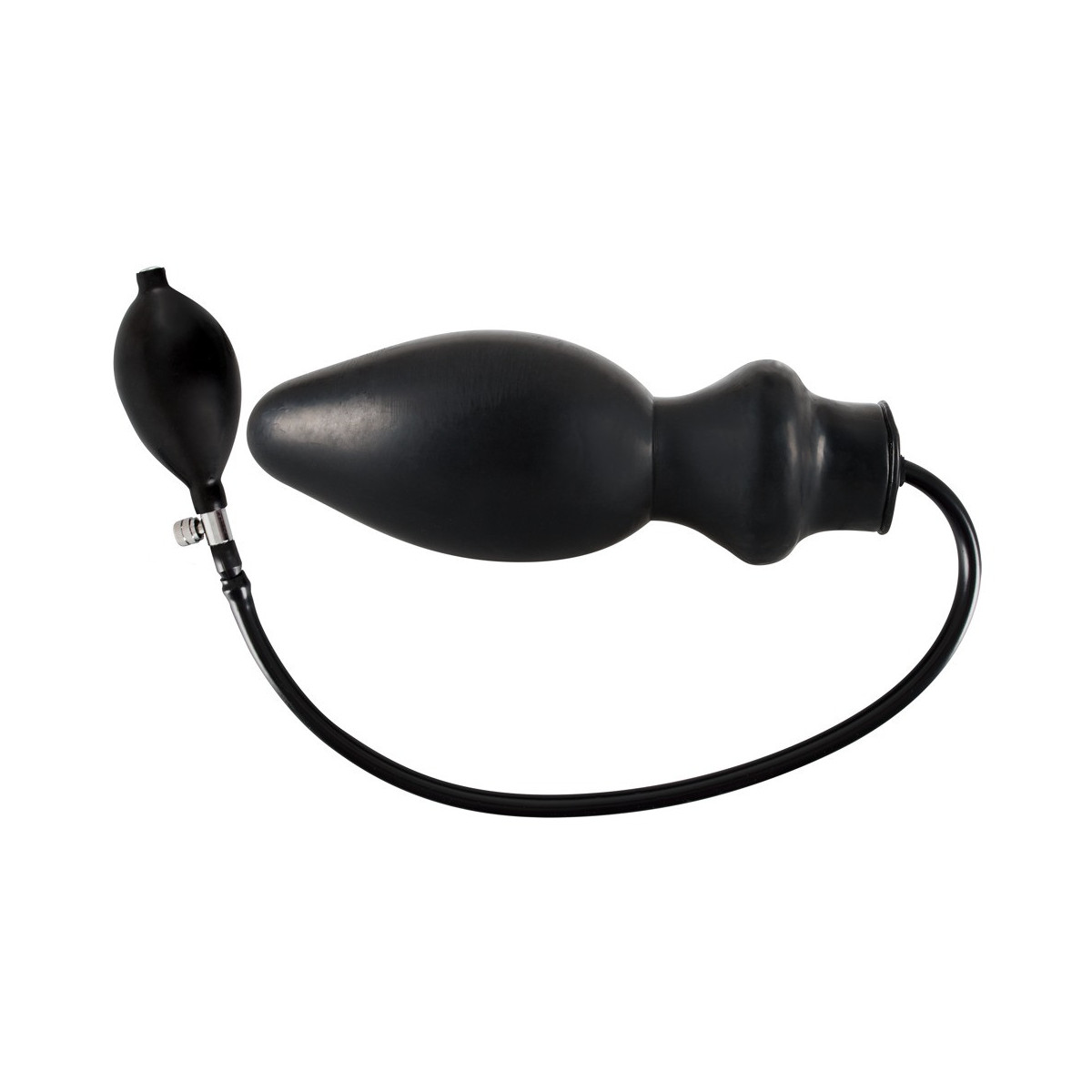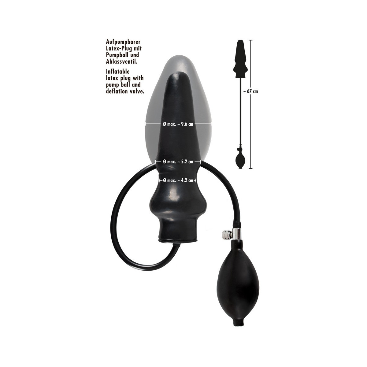 Plug anale gonfiabile in lattice nero. Circa 20 cm di lunghezza, Ø 2,5-5,2 cm - pompabile fino a 9,6 cm. Lunghezza del tubo circa 39 cm. Con pompa manuale e valvola di scarico. Materiale: lattice.