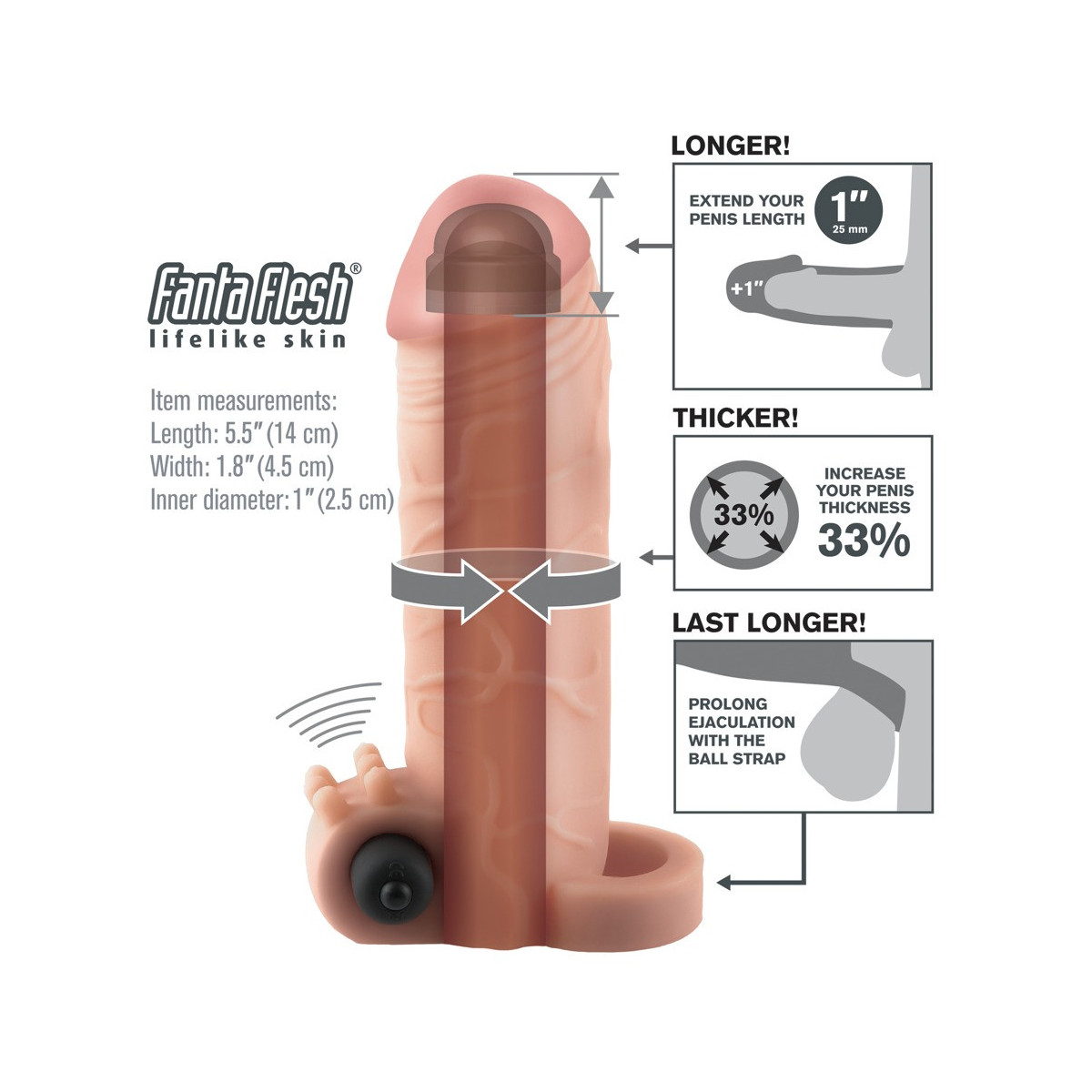Questo copripene in materiale elastico morbido e simile alla pelle (Fanta Flesh) mette il pene in ottima forma per soddisfare i momenti di lussuria. La copertura aderente, che sostiene l'erezione, viene semplicemente fatta scivolare sul pene eretto e, grazie all'anello per testicoli, garantisce una calzata salda e confortevole senza scivolare. Grazie al magnifico diametro esterno, il pene è più grande del 33% in circonferenza. E il glande massiccio è allungato di 2,5 cm! Il piccolo e potente vibro proiettile è inserito nell'anello superiore e fornisce un'eccitante stimolazione aggiuntiva. Anche nella vasca da bagno o nella doccia, perché è impermeabile! Batteria inclusa (3 x LR44) per il vibro proiettile.