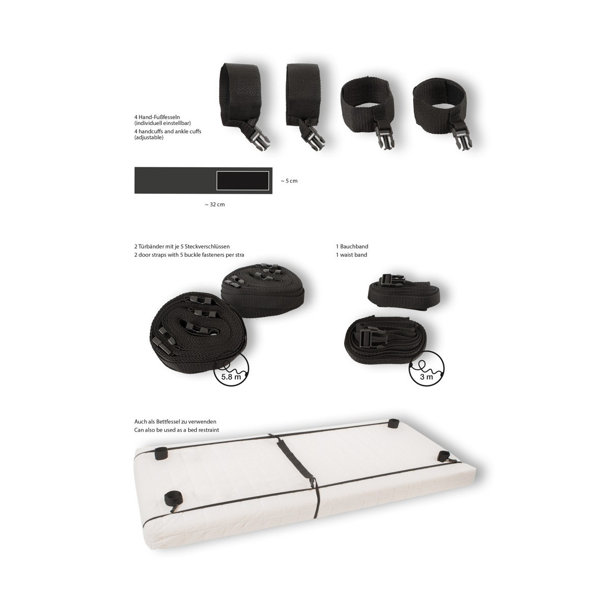 Con questo set di costrizioni per porte e letti di Bad Kitty, qualsiasi letto o porta può essere trasformato in un parco giochi bondage professionale. Non importa se a casa o in viaggio. Il set consiste in 2 cinghie lunghe, 1 cinghia in vita e 4 cinghie per mani e piedi. Le cinghie regolabili e resistenti allo strappo si adattano alla lunghezza di qualsiasi materasso o porta. La cintura addominale regolabile e le cinghie per mani e piedi sono poi bloccate alle sei chiusure a scatto delle due cinghie. I comodi polsini per le mani e le caviglie sono dotati di pratiche chiusure in velcro e possono quindi essere regolati per adattarsi a LEI o a LUI. Cinghie da letto/porta ciascuna lunga 5,80 m (regolabile); cinghia in vita lunga 3 m (regolabile), rinforzata al centro lunga 50 cm; polsini di contenimento larghi 5 cm, lunghi 32 cm, regolabili con velcro. PP, PS.