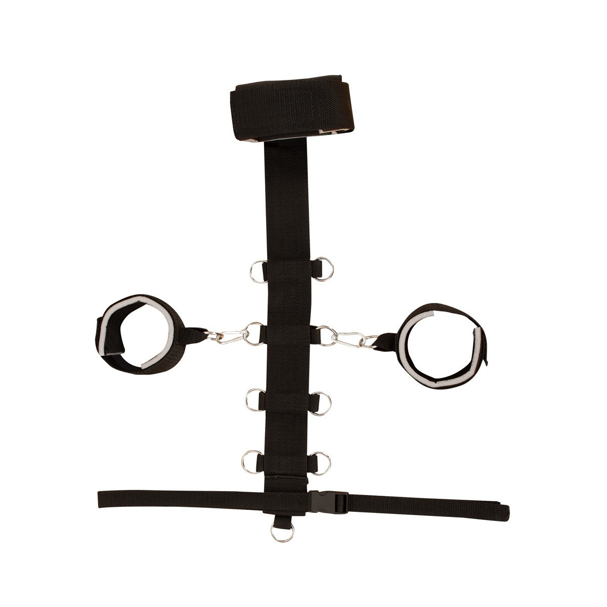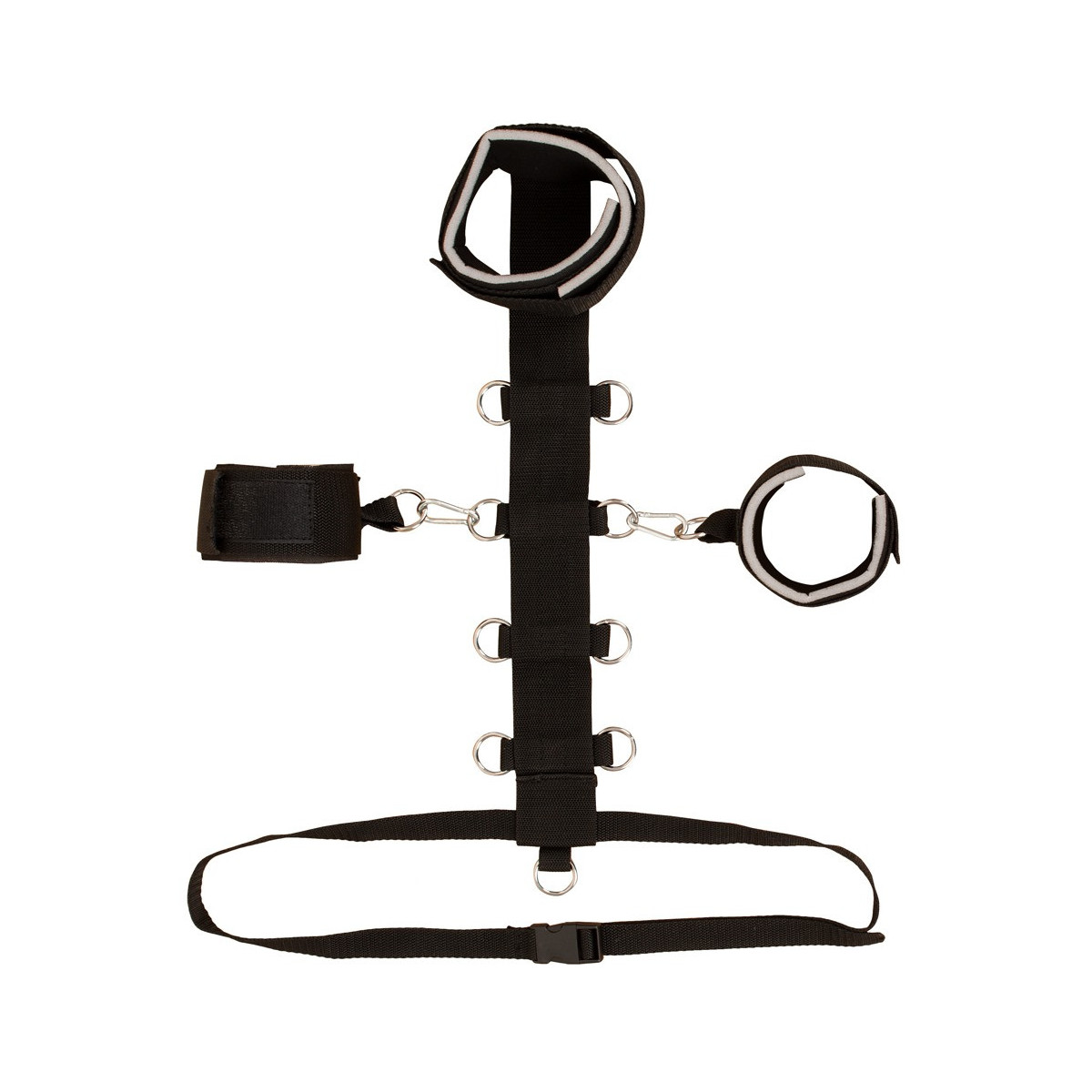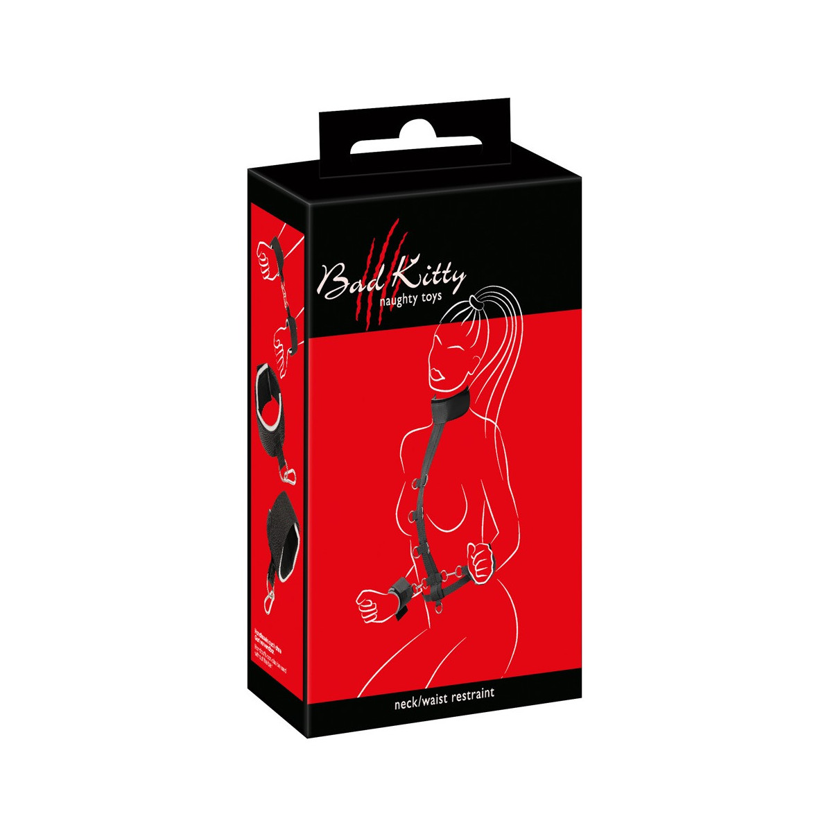 Il set di costrizione del collo di Bad Kitty combina una costrizione del collo (con barra centrale) con manette e una cintura in vita. La barra centrale è dotata di 9 anelli a D in cui le manette possono essere agganciate con i loro moschettoni. La cintura regolabile in vita, con pratica chiusura, viene tirata attraverso il lembo inferiore della cinghia centrale. I polsini del collo e delle mani sono leggermente imbottiti e regolabili con chiusure in velcro per adattarsi perfettamente. La cinghia centrale e la cintura in vita sono fatte di materiale intrecciato resistente agli strappi.
