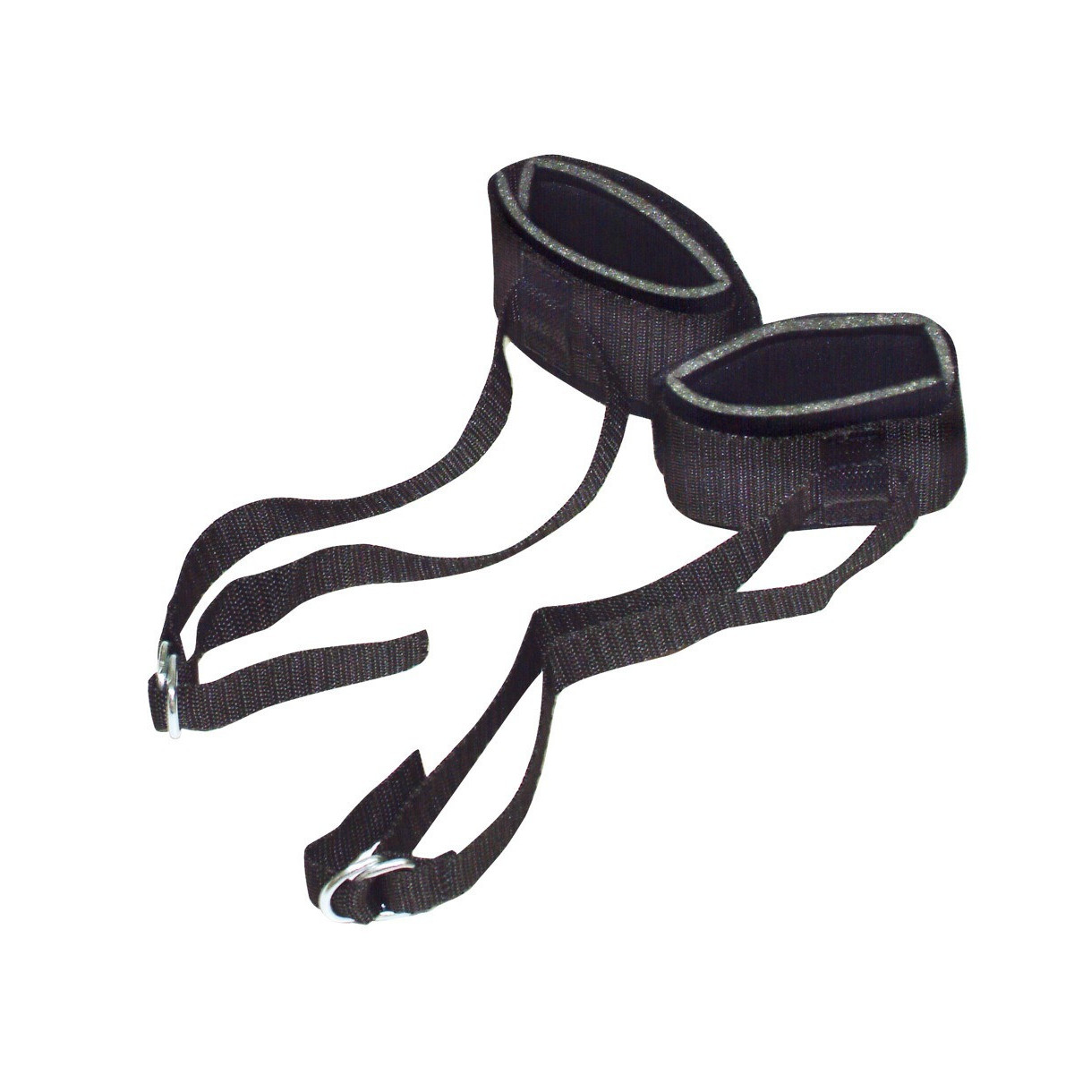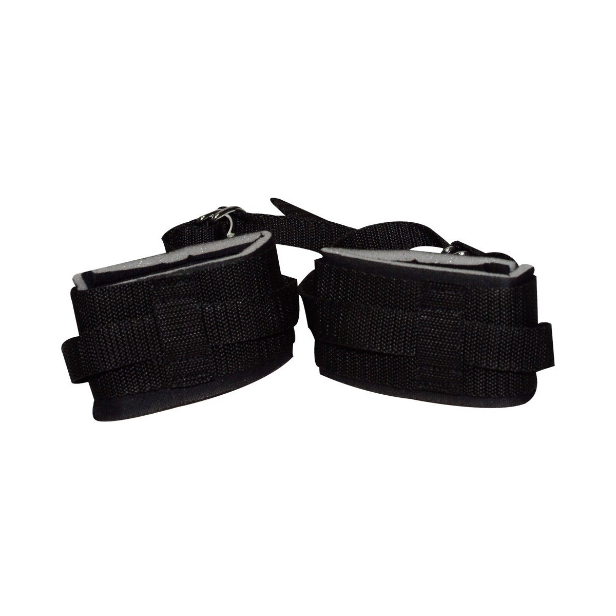 Due manicotti per i polsi imbottiti con chiusure a velcro per mani e piedi. Con i nastri regolabili in lunghezza fissati, potete legare la vostra vittima quasi ovunque. Neri e a prova di strappo. Materiale: poliammide, espanso.