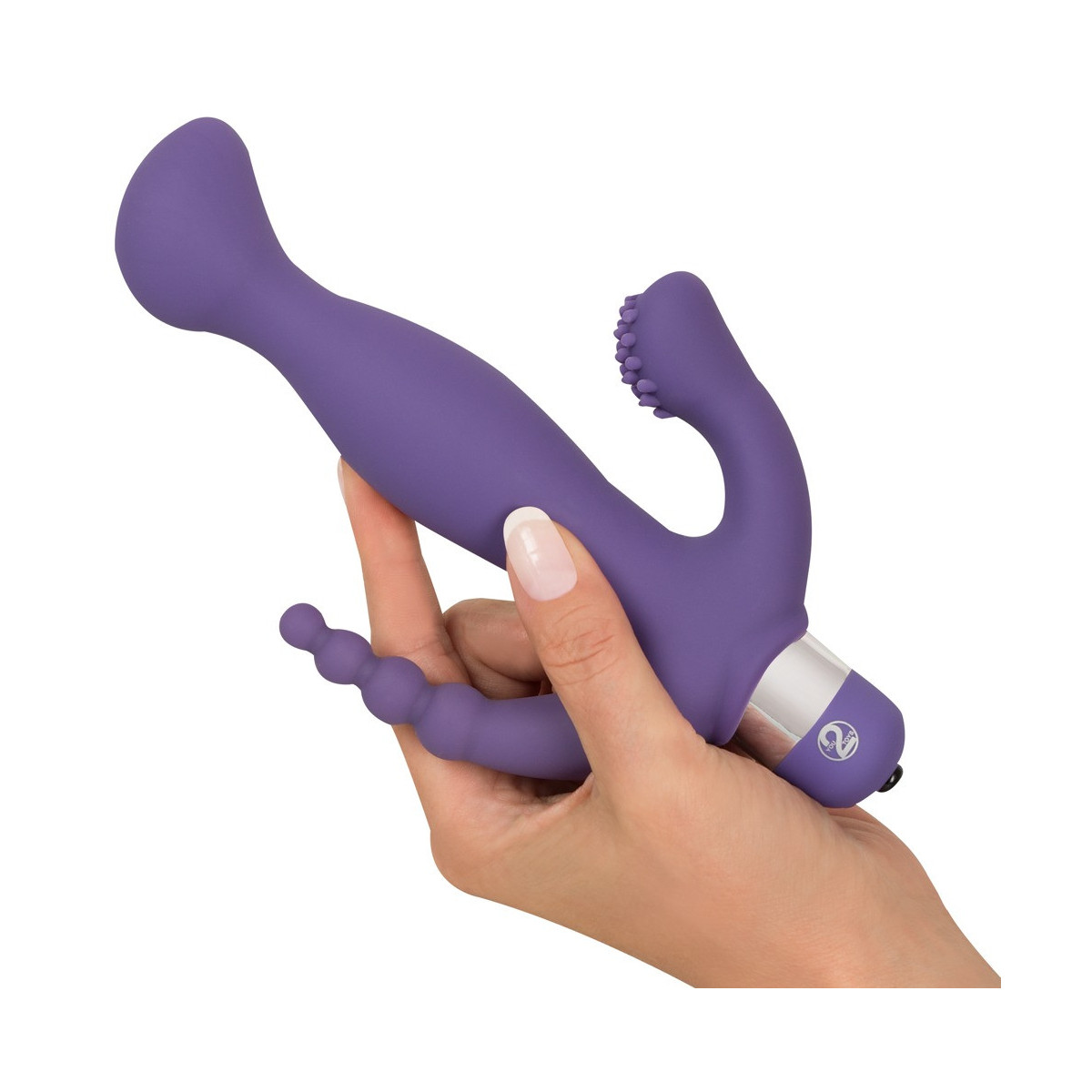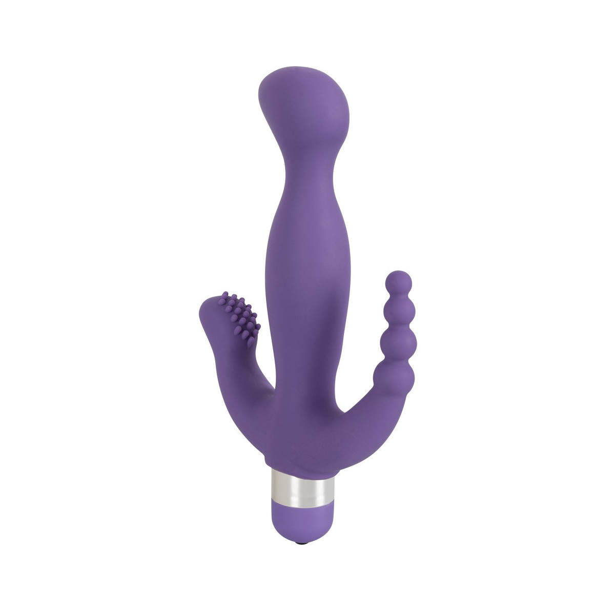 Questo vibratore viola con finiture in argento, albero conico e punta curva non vi rovinerà da soli. No! Viene fornito anche con uno stimolatore del clitoride a livello superficiale e uno stimolatore dell'ano costituito da quattro sfere più grandi. Tanta stimolazione in una volta sola ti farà impazzire! A seconda del vostro umore, potete facilmente determinare l'intensità della vibrazione con la semplice pressione di un pulsante - 5 diverse modalità, dal tocco delicato all'infuriamento violento, sono a vostra disposizione.