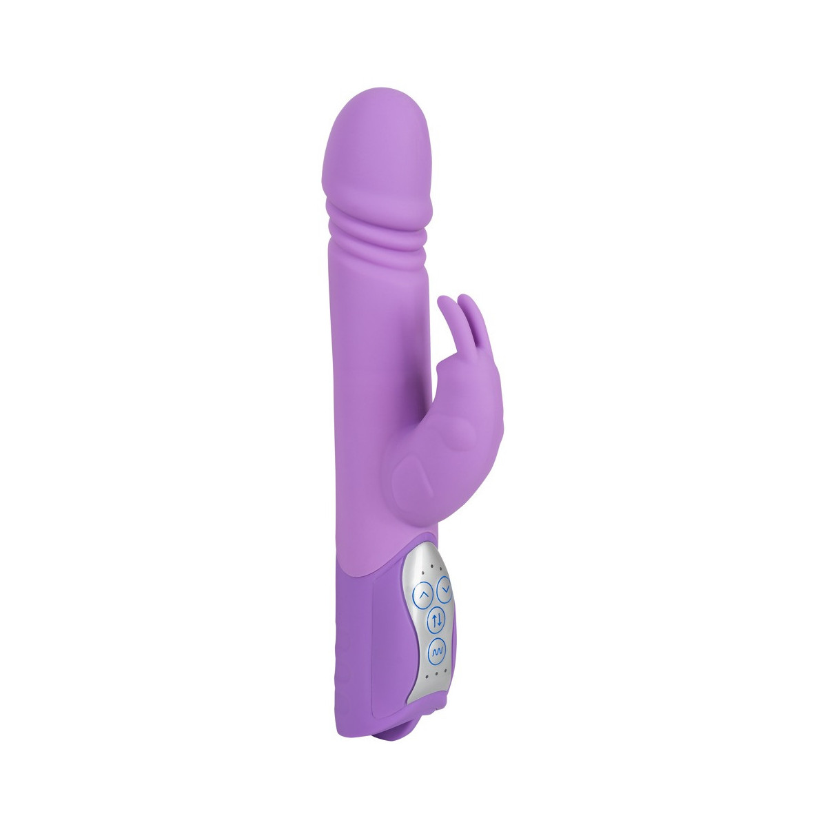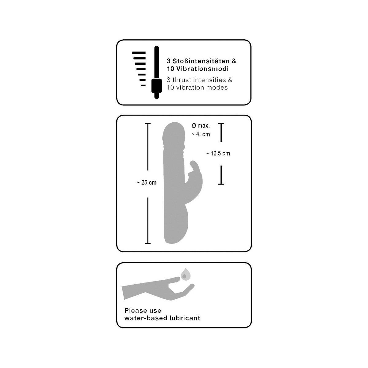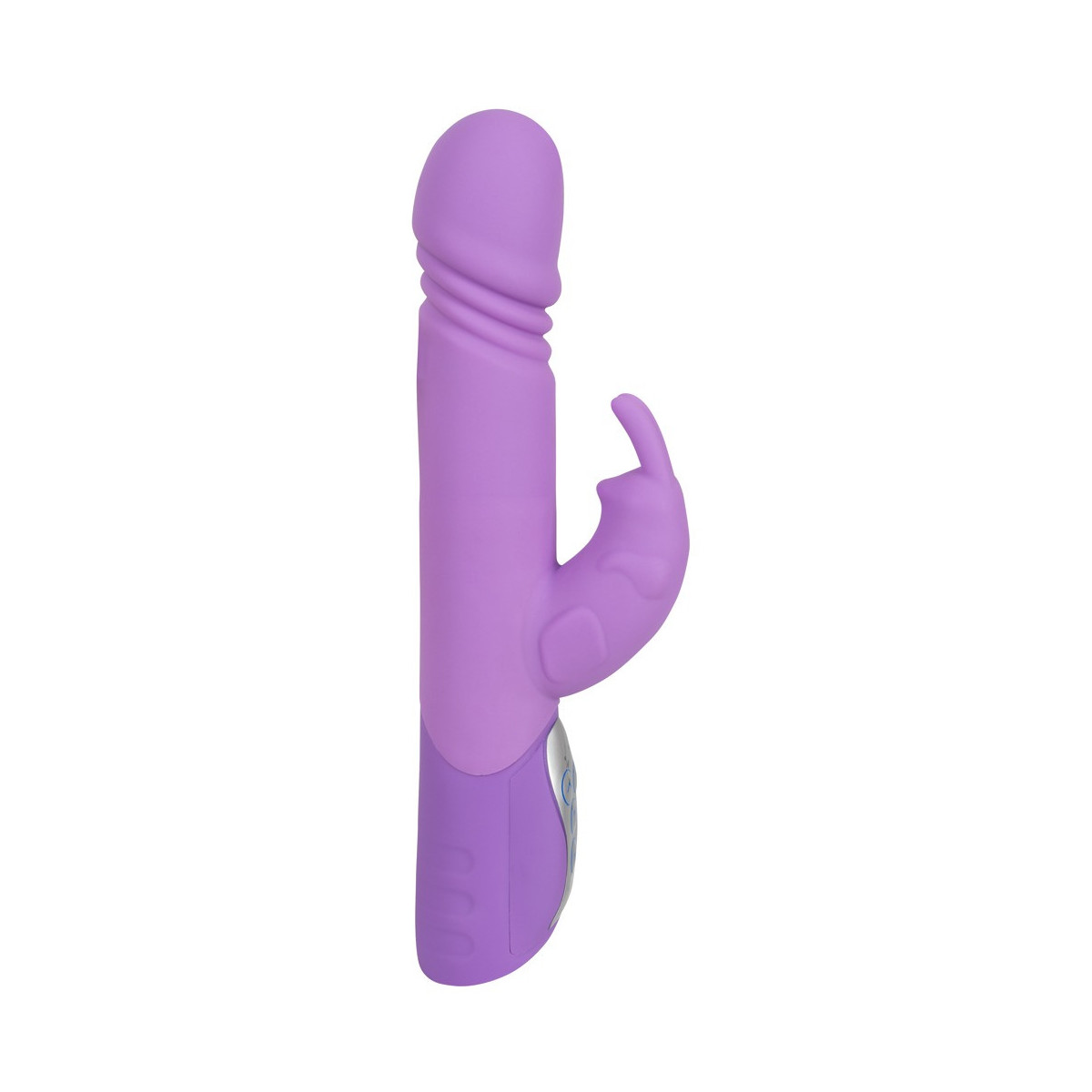 Questo vibratore rabbit viola con stimolatore clitorideo a forma di coniglietto con le orecchie mobili è una vera e propria centrale elettrica: coccola con 10 diverse modalità di vibrazione e un'eccitante funzione di spinta a 3 velocità. 3 scanalature che inducono al piacere sotto la punta.