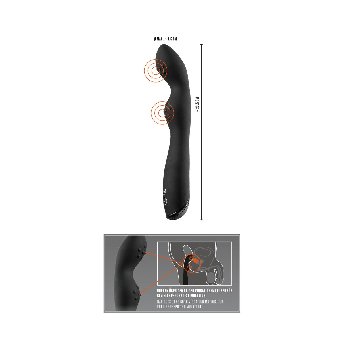 Lunghezza totale 23,5 cm, lunghezza d'inserimento 18 cm, Ø 3,6 cm. Silicone, PU, ABS.