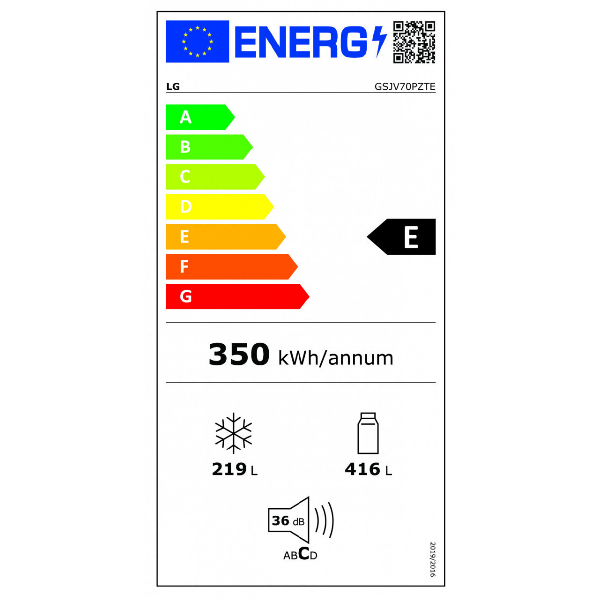 LG GSJV70PZTE. Posizionamento dell'apparecchio: Libera installazione, Design del prodotto: Porta francese, Colore del prodotto: Argento. Capacità netta totale: 635 L, Classe climatica: T, Classe emissione rumore: C. Capacità netta frigorifero: 416 L. Capacità netta congelatore: 219 L, Posizione del congelatore: Posizionato lateralmente, Capacità di congelamento: 12 kg/24h. Classe efficienza energetica: E, Consumo energetico annuo: 350 kWh, Scala di efficienza energetica: Da A a G