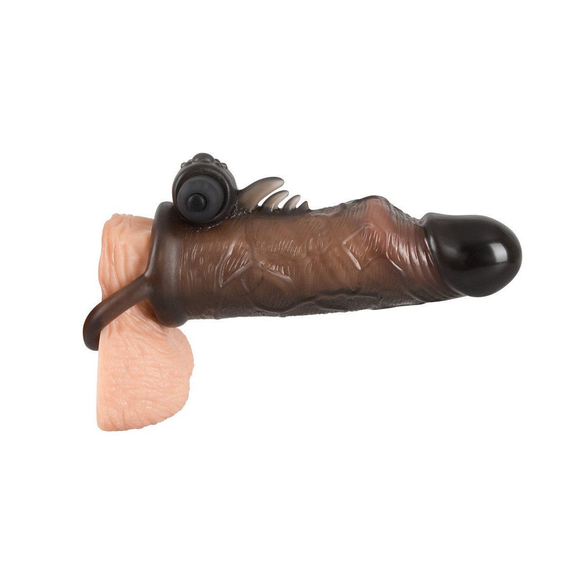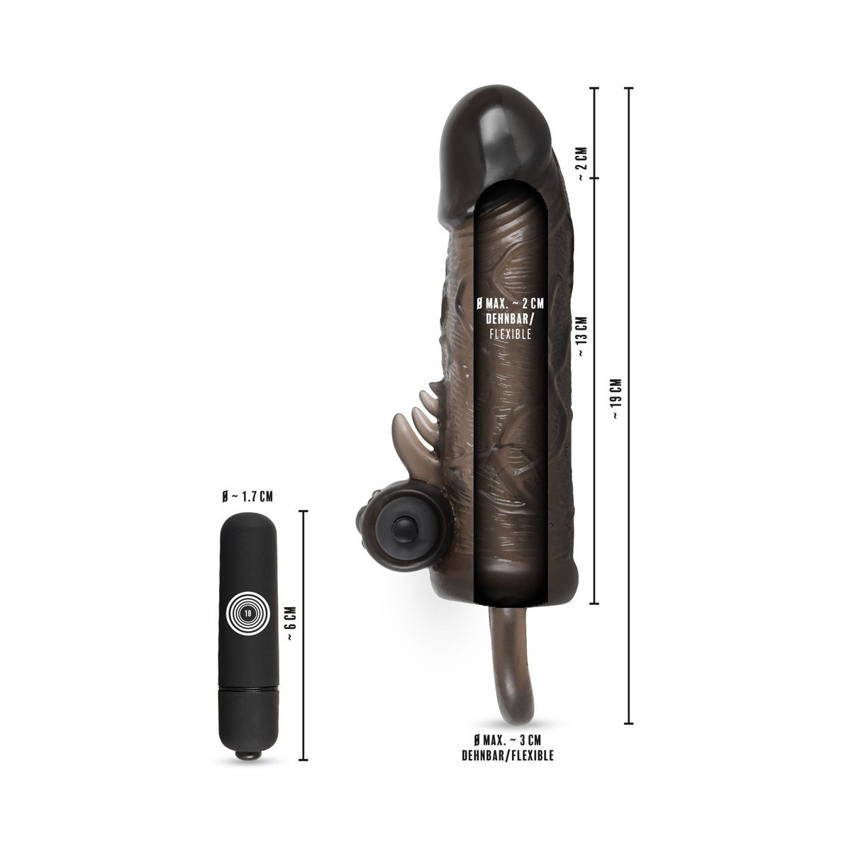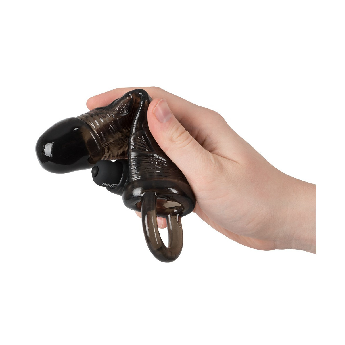 Questo copripene ispira con anello per testicoli e vibro-proiettile. Il coperchio, che è molto flessibile come l'anello ed è dotato di un glande sporgente e di venature pronunciate, si rovina con 4 piccoli rebbi di stimolo e un vano di inserimento nubbed per il Vibro-Bullet chiuso, che ha 10 diverse modalità.