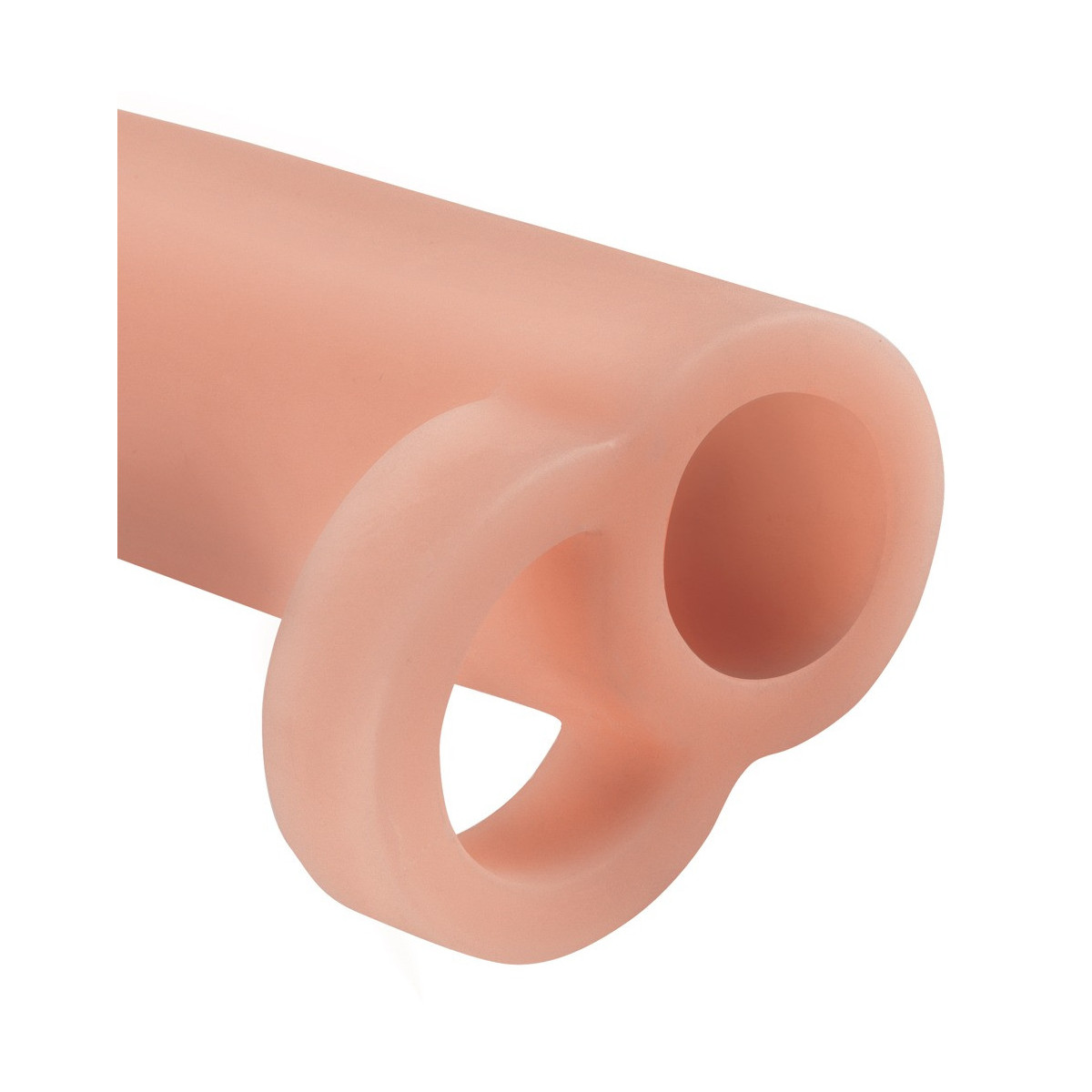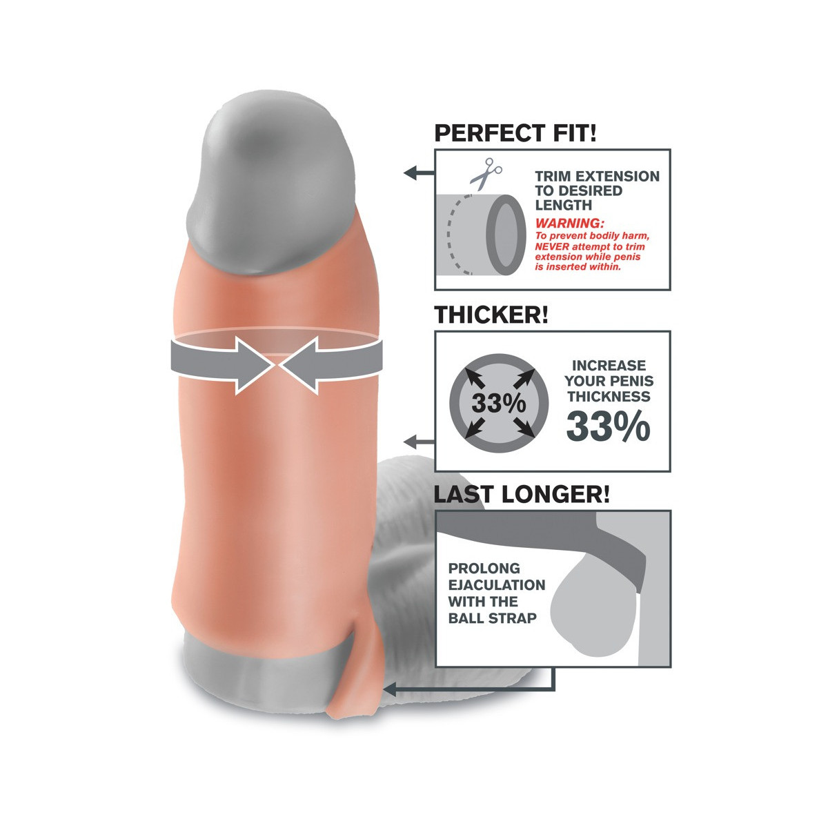 Questa copertura per il pene in materiale elastico morbido e simile alla pelle (Real Feel) porta il pene al massimo della forma per soddisfare i momenti di lussuria. La copertura aderente viene semplicemente fatta scivolare sul pene eretto e garantisce una calzata salda e confortevole senza scivolare grazie all'anello per testicoli. Grazie al magnifico diametro esterno, il pene è più grande del 33% in circonferenza. La guaina è aperta nella parte superiore per esporre il glande sensibile e può essere accorciata con le forbici se necessario per una perfetta vestibilità.