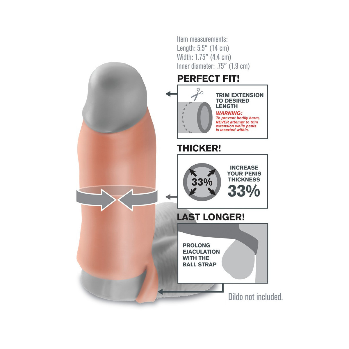 Questa copertura per il pene in materiale elastico morbido e simile alla pelle (Real Feel) porta il pene al massimo della forma per soddisfare i momenti di lussuria. La copertura aderente viene semplicemente fatta scivolare sul pene eretto e, grazie all'anello per testicoli, garantisce una calzata salda e confortevole senza scivolare. Grazie al magnifico diametro esterno, il pene è più grande del 33% in circonferenza. La guaina è aperta nella parte superiore per esporre il glande sensibile e può essere accorciata con le forbici se necessario per una perfetta vestibilità.