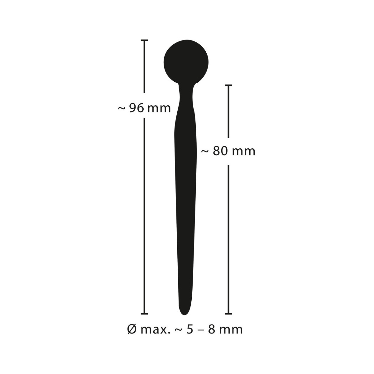Lunghezza totale 9,6 cm. Lunghezza d'inserimento 8 cm; Ø 0,5 cm-0,8 cm, tappo Ø 1,6 cm. Silicone, PU, ABS.
