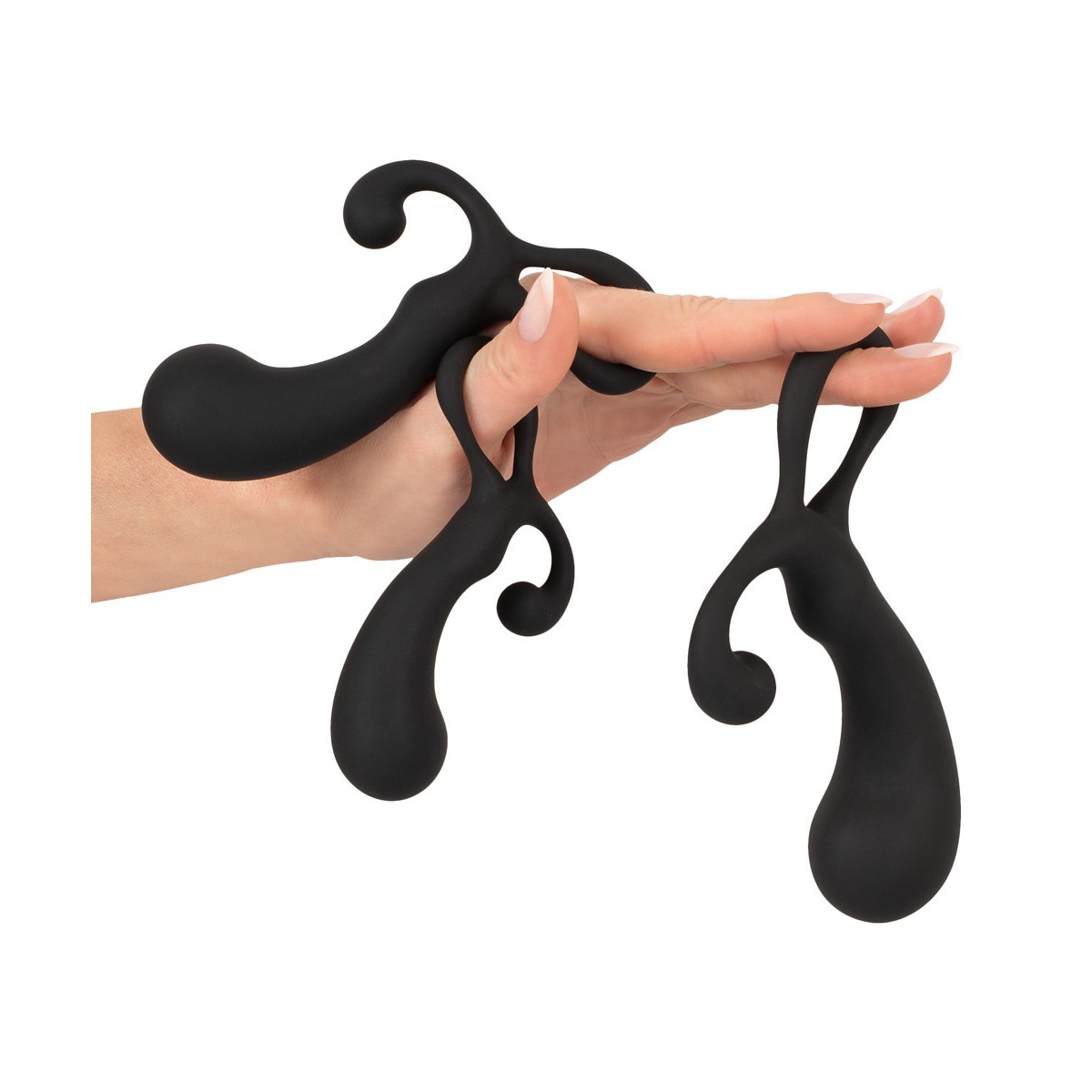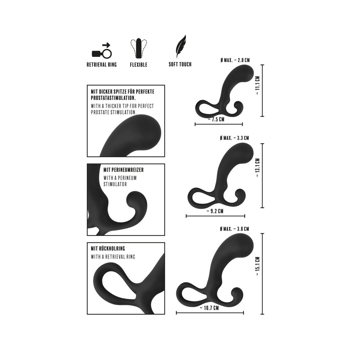 3-Piece Prostate Plug Set di Rebel con 3 plug anali di diverse dimensioni e pesi per una stimolazione mirata della prostata e un perfetto allenamento di stretching. Ogni plug dalla forma ergonomica e ottimale con la punta del punto P, lo stimolatore del perineo curvo e il pratico anello per le dita che funge anche da tappo. Dimensioni: