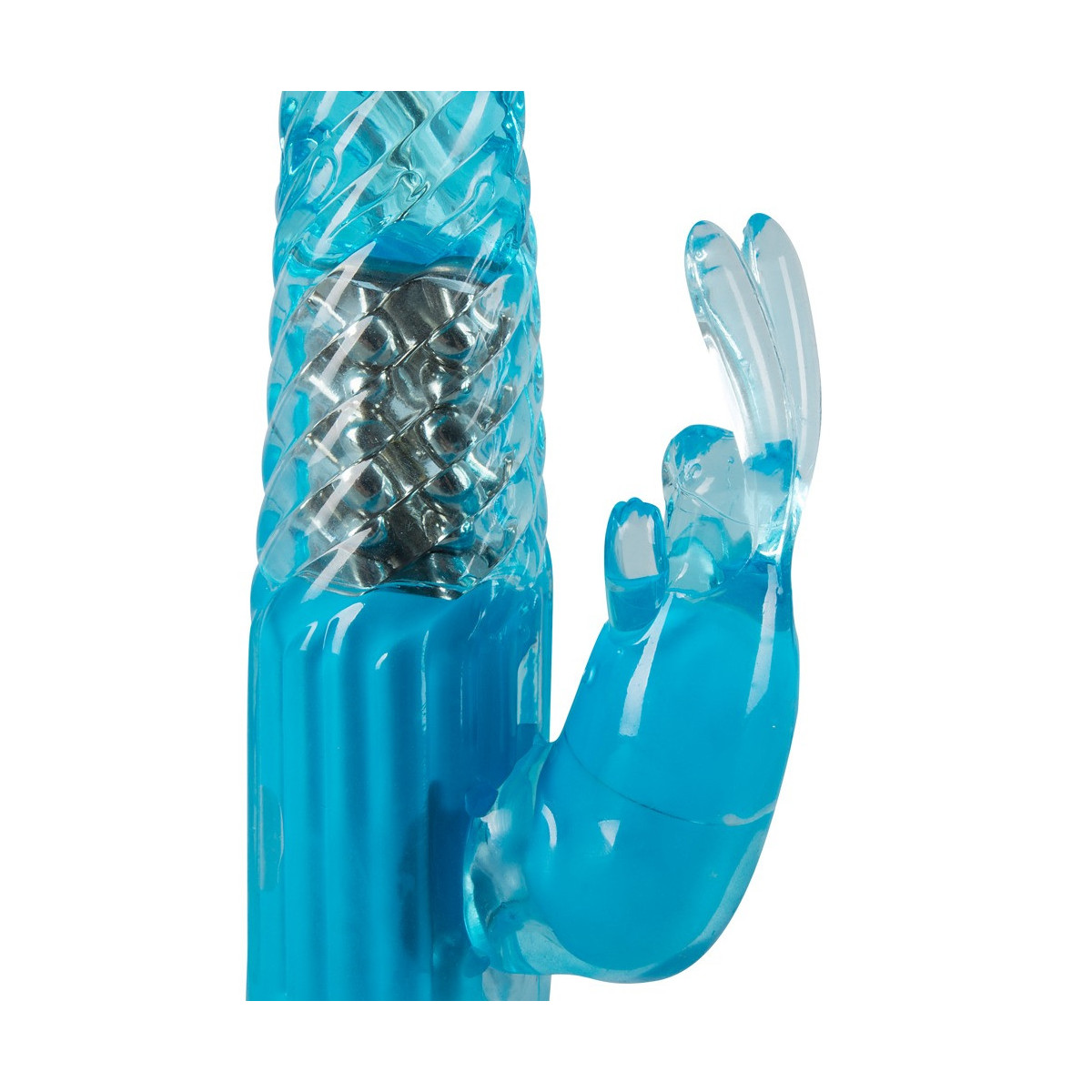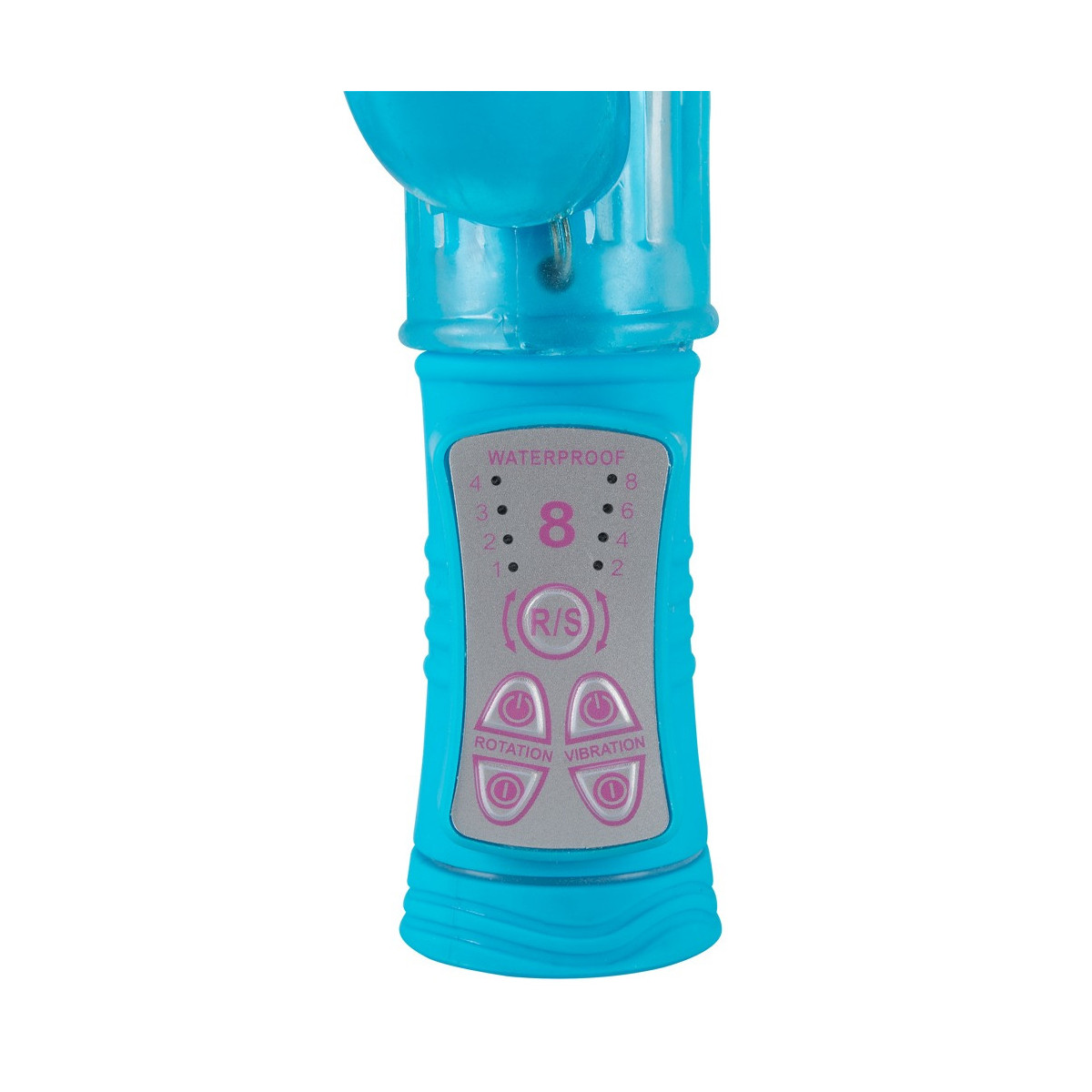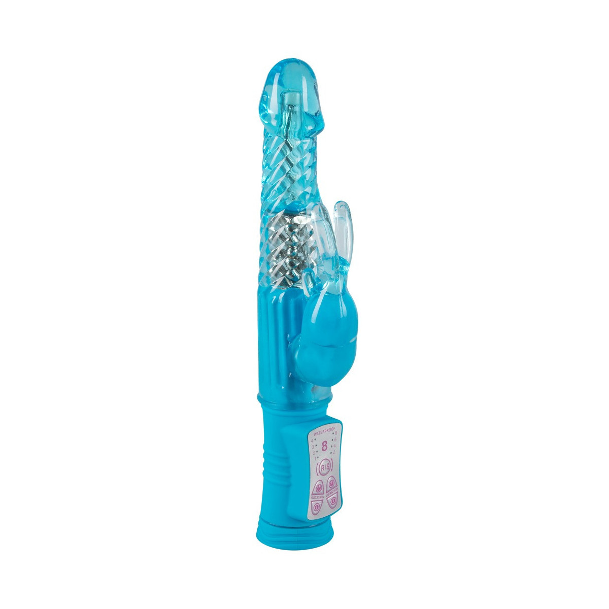 Vibratore a perla con albero rotante e braccio di stimolazione del clitoride a forma di coniglio con orecchie flessibili. 4 livelli di rotazione e 8 livelli di vibrazione regolabili separatamente con la semplice pressione di un pulsante. Lunghezza totale ca. 22 cm, diametro: ca. 2,6 - 3,2 cm. Colore: turchese.