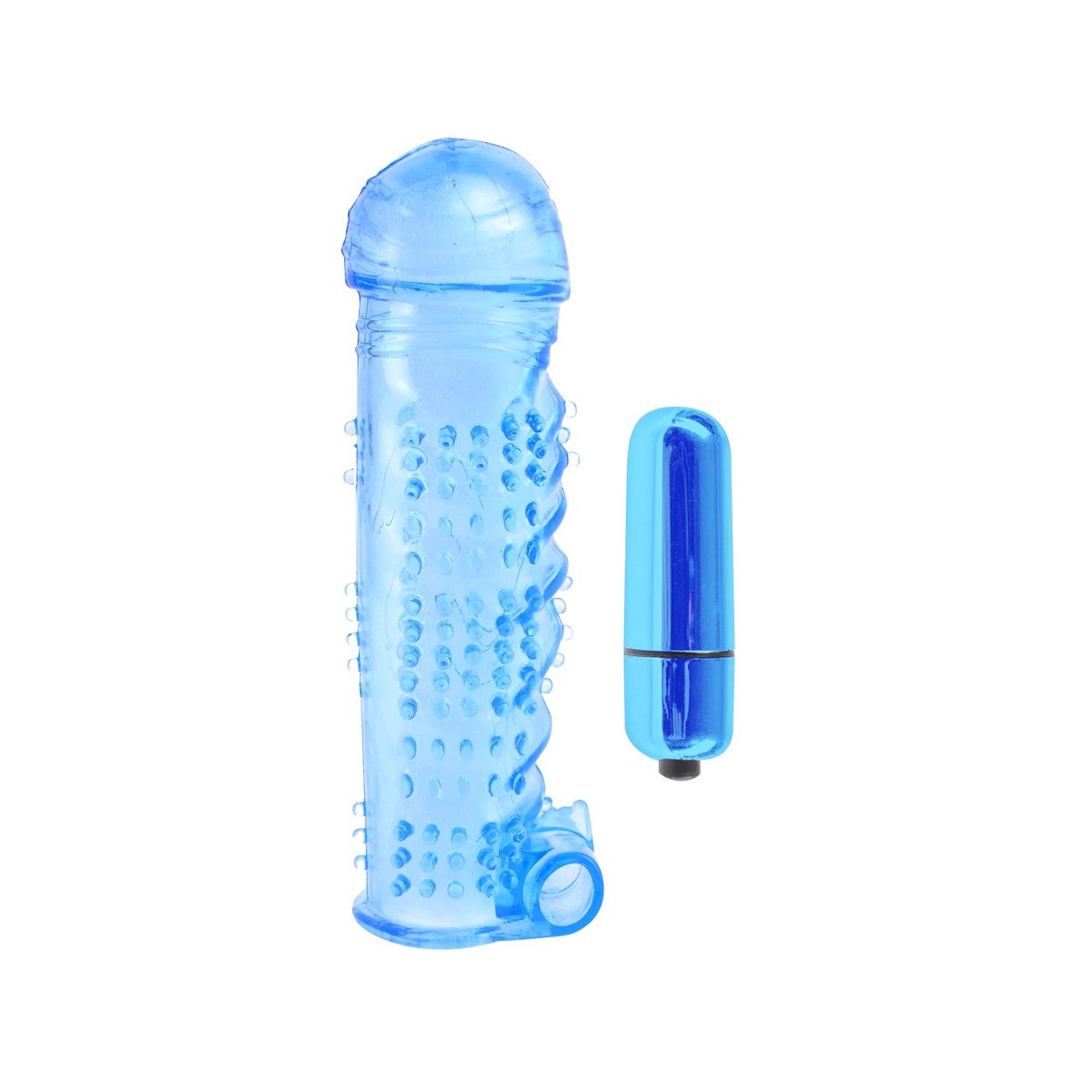 Lunghezza totale manica 14 cm, Ø interno 4,4 cm (molto elastico); lunghezza totale vibrobullet 5,7 cm. TPE, ABS.