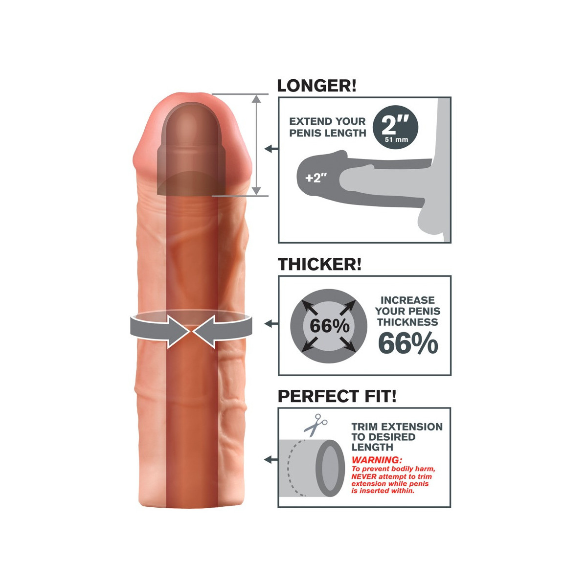 Guaina per il pene con forti venature e glande saldamente imbottito, che estende il pene di 5,1 cm. Ispessisce il pene del 66% e allo stesso tempo fornisce un supporto per l'erezione. Può essere regolato individualmente.
