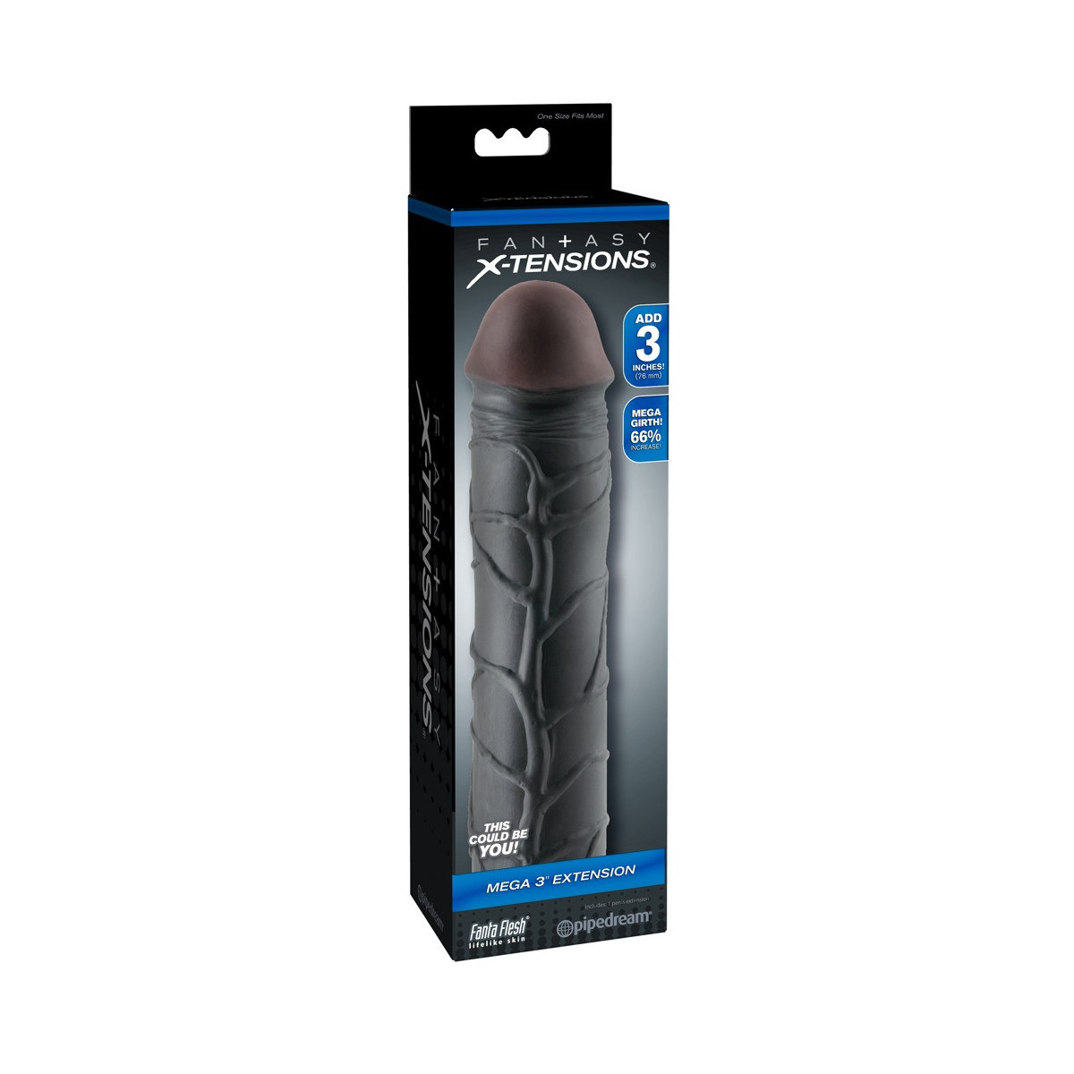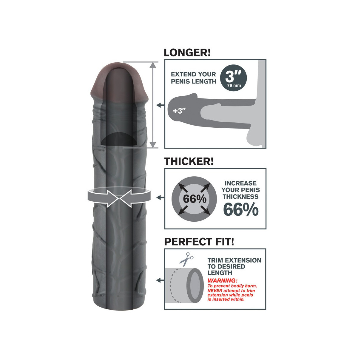 Guaina per il pene con forti venature e glande saldamente imbottito, che estende il pene di 7,6 cm. Ispessisce il pene del 66% e allo stesso tempo fornisce un supporto per l'erezione. Può essere regolato individualmente.