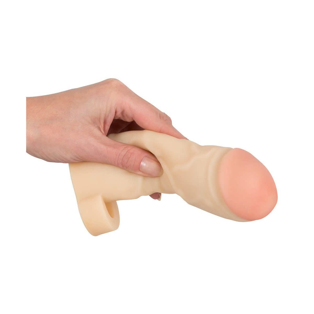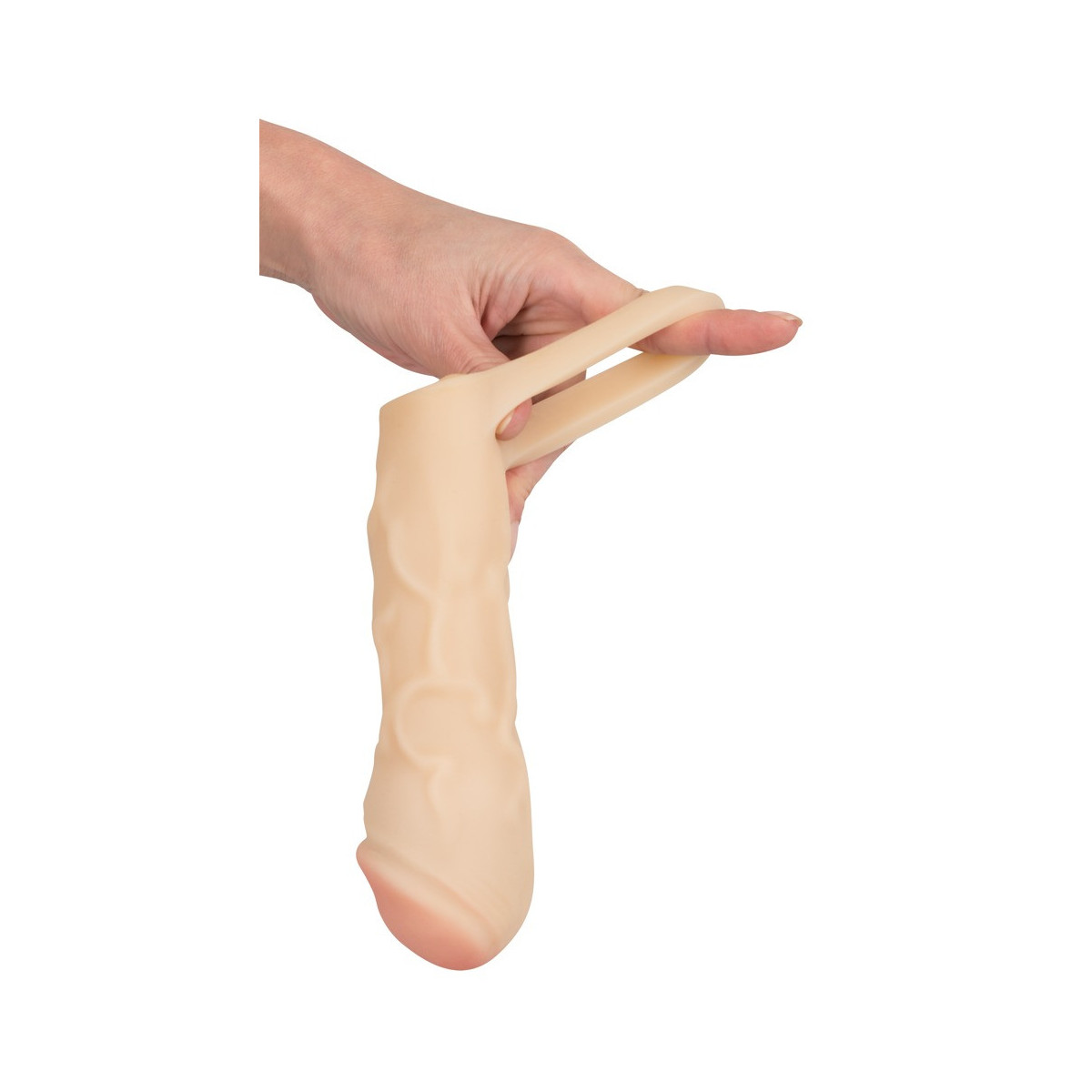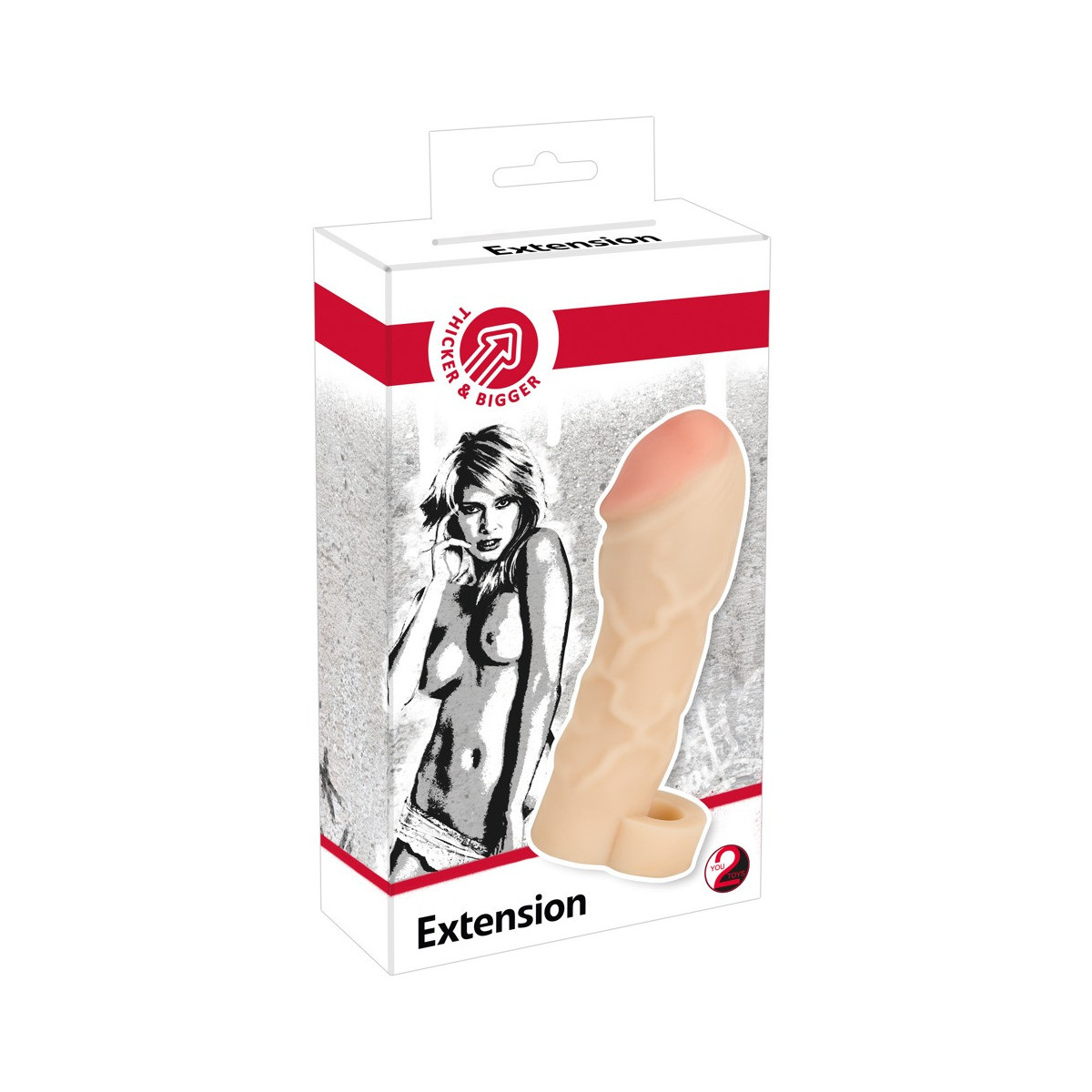 Guaina per pene con venature distinte e anello per testicoli Thicker & Bigger Extension di You2Toys mette il pene in ottima forma per riempire i momenti di piacere. La guaina elastica e aderente fatta di materiale simile alla pelle viene semplicemente infilata sul membro eretto. L'anello integrato per i testicoli assicura una vestibilità ferma e confortevole senza scivolare. Grazie allo spessore del materiale di 1 cm, il pene è notevolmente ingrandito in circonferenza. E l'enorme glande extra paffuto si estende di ben 5 cm!