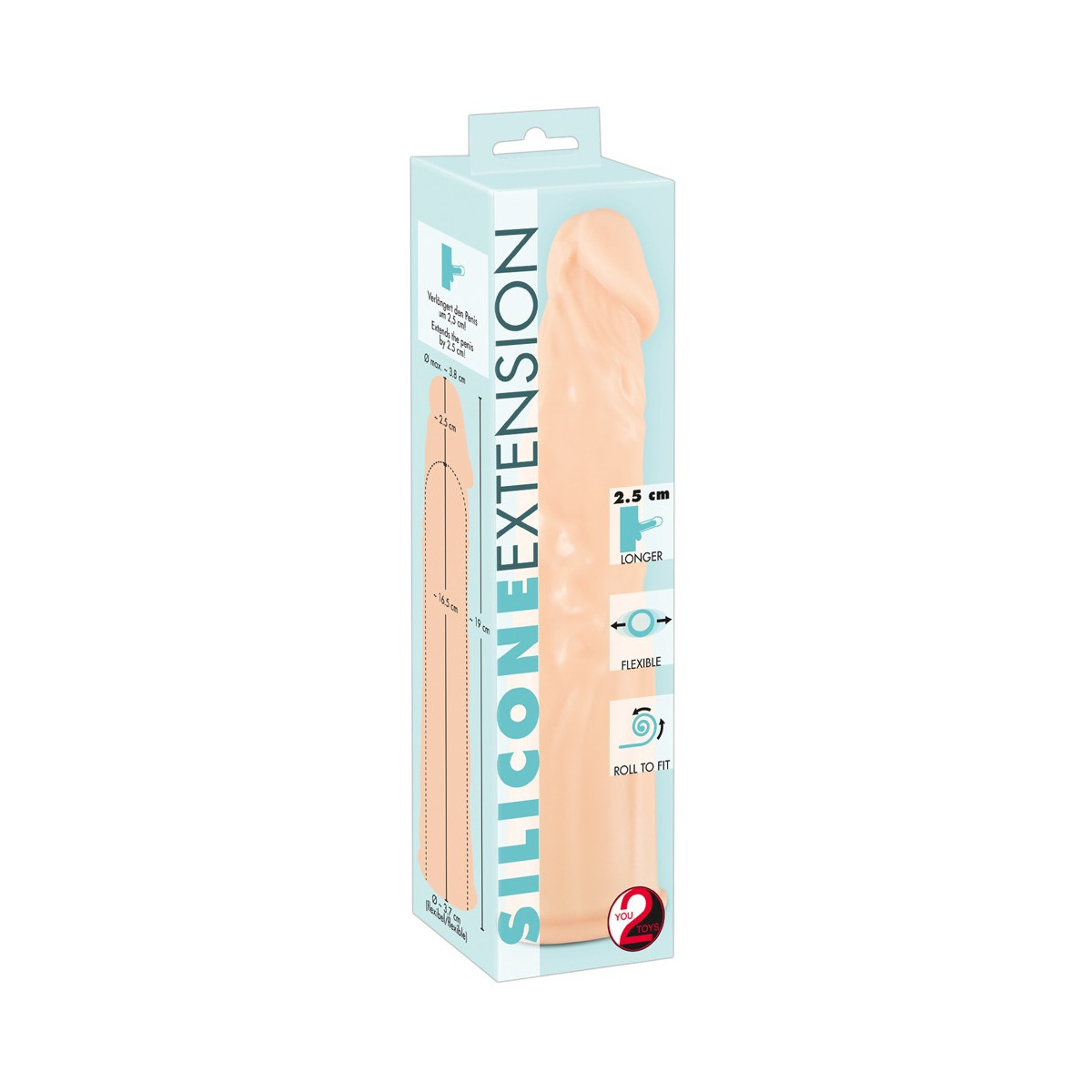 Lunghezza totale 19 cm, profondità di inserimento 16,5 cm, Ø 3,7 cm. silicone.