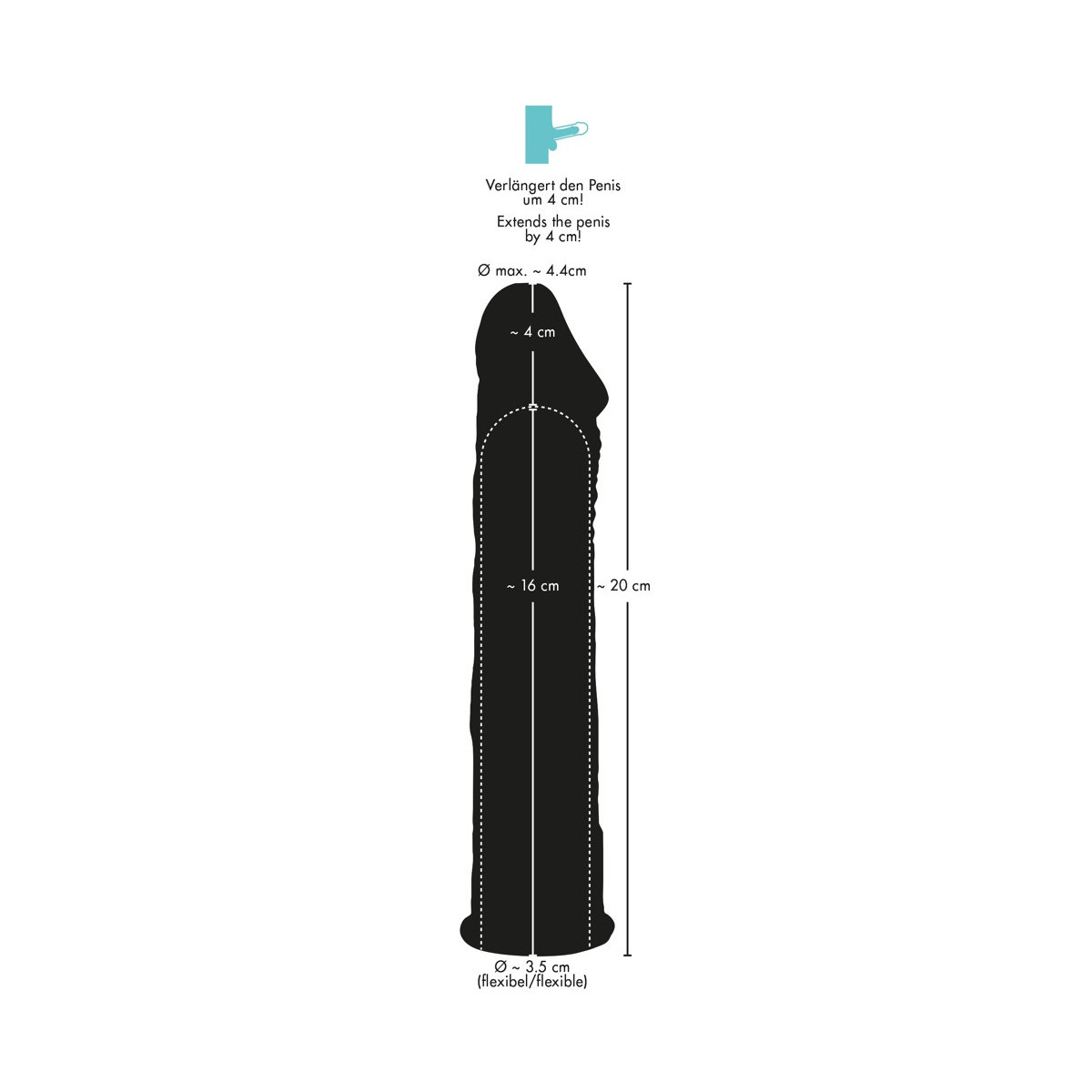 Lunghezza totale 20 cm, profondità di inserimento 16 cm, Ø 4,4 cm. silicone.