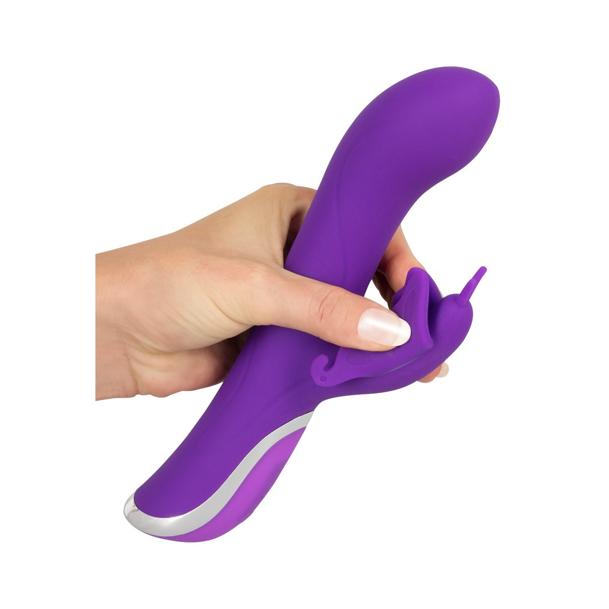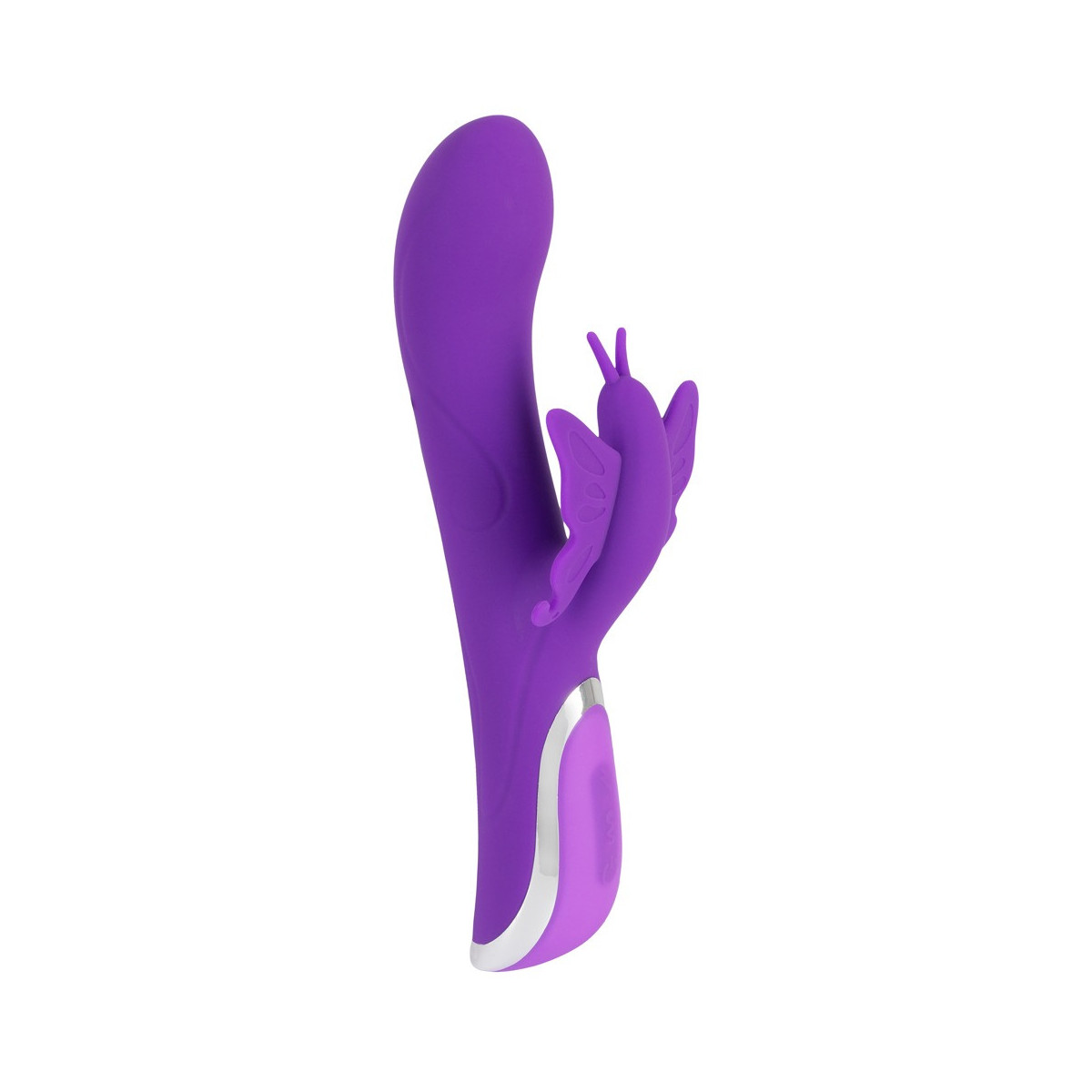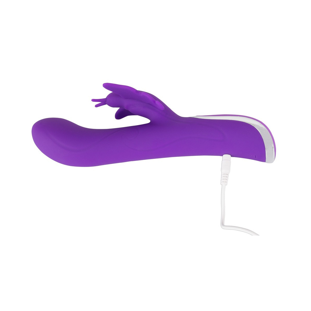 Vibratore Rabbit ricaricabile con albero leggermente curvo e farfalla come stimolatore clitorideo. 10 modalità di vibrazione nel braccio stimolatore clitorideo e 3 velocità di rotazione nella punta dell'asta. Controllabile separatamente. Con scanalature decorative di stimolazione.