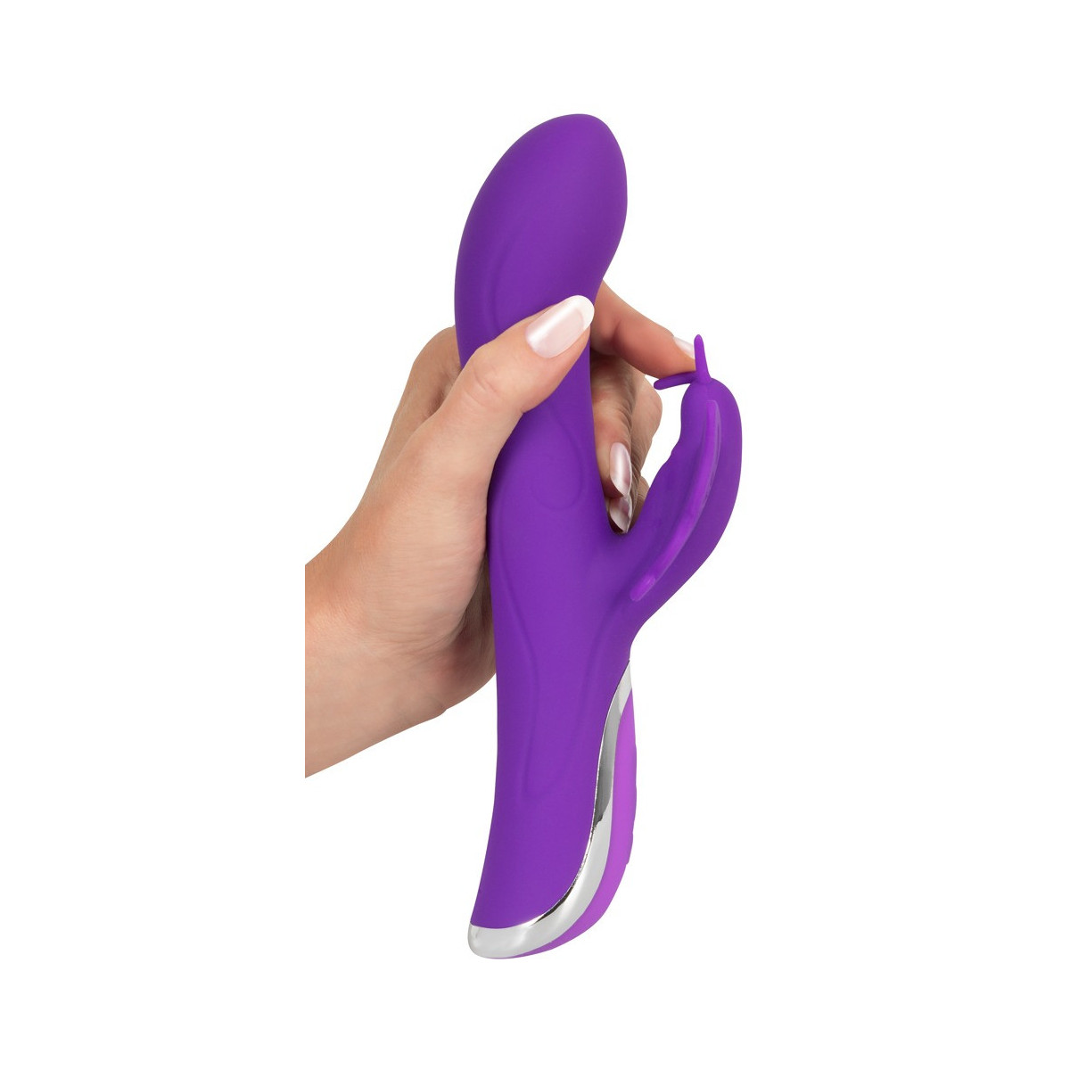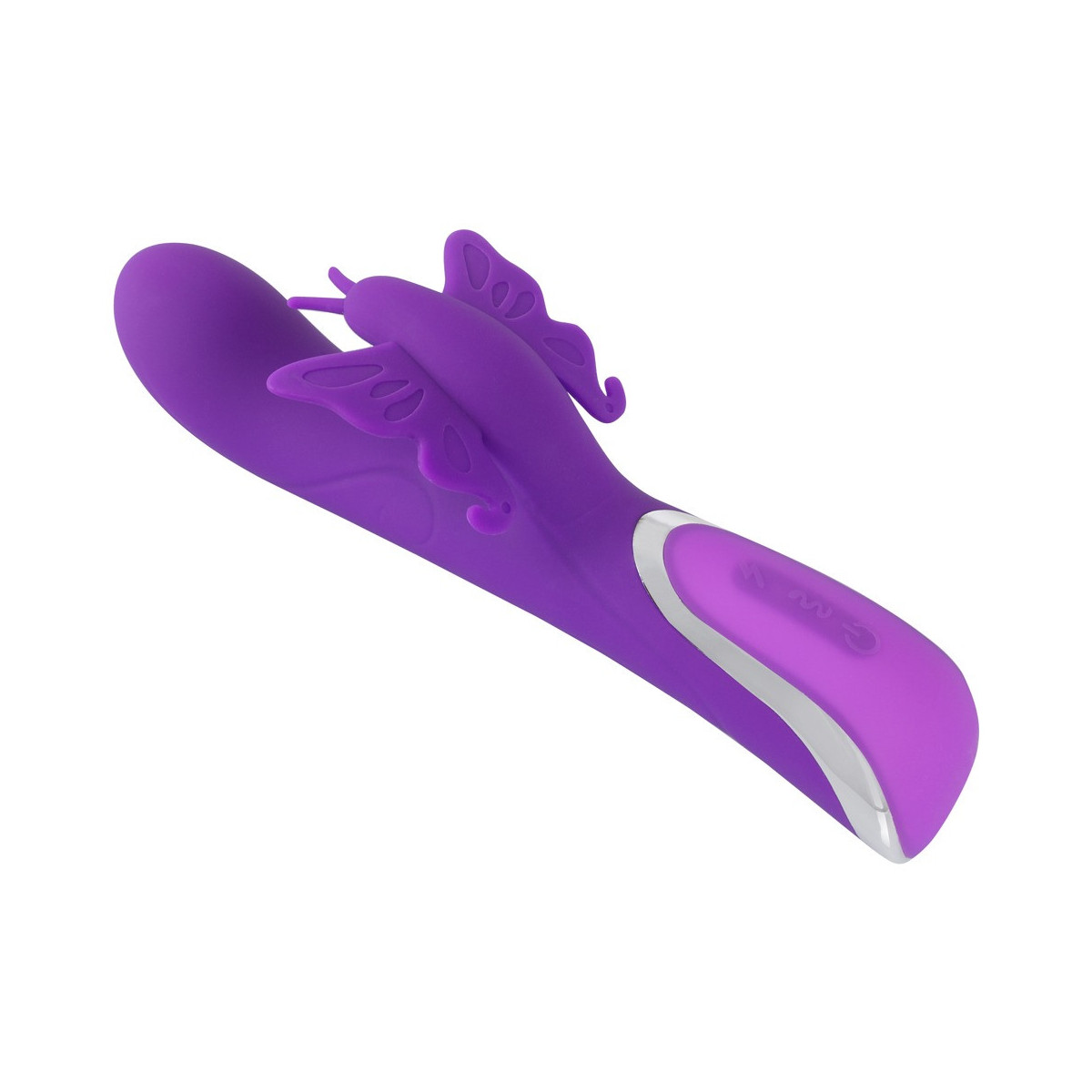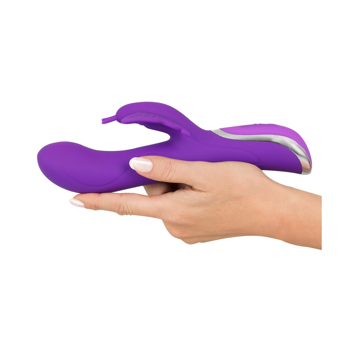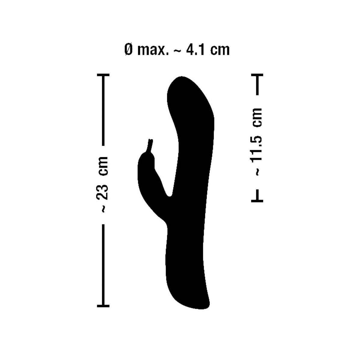 Vibratore Rabbit ricaricabile con albero leggermente curvo e farfalla come stimolatore clitorideo. 10 modalità di vibrazione nel braccio stimolatore clitorideo e 3 velocità di rotazione nella punta dell'asta. Controllabile separatamente. Con scanalature decorative di stimolazione.