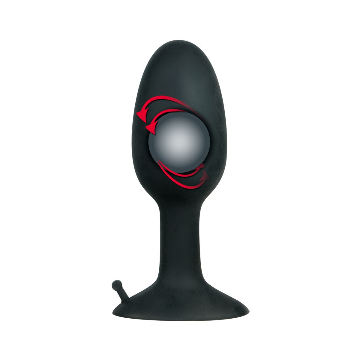 Tappo anale nero con sfera di stimolazione rotante interna, punta arrotondata e ventosa ben aderente. Lunghezza totale 8 cm, profondità di inserimento 7 cm. Ø da 1 a 2,8 cm. Materiale: silicone.