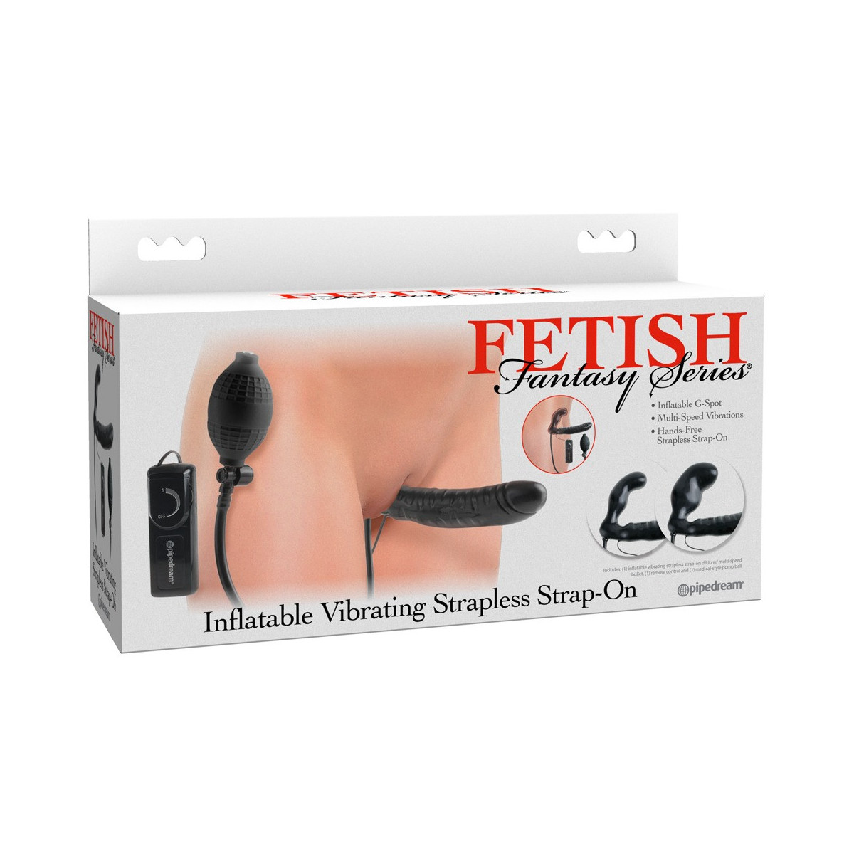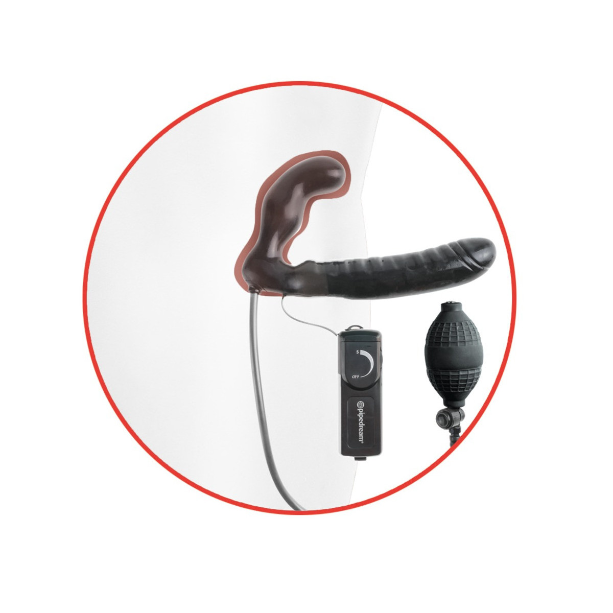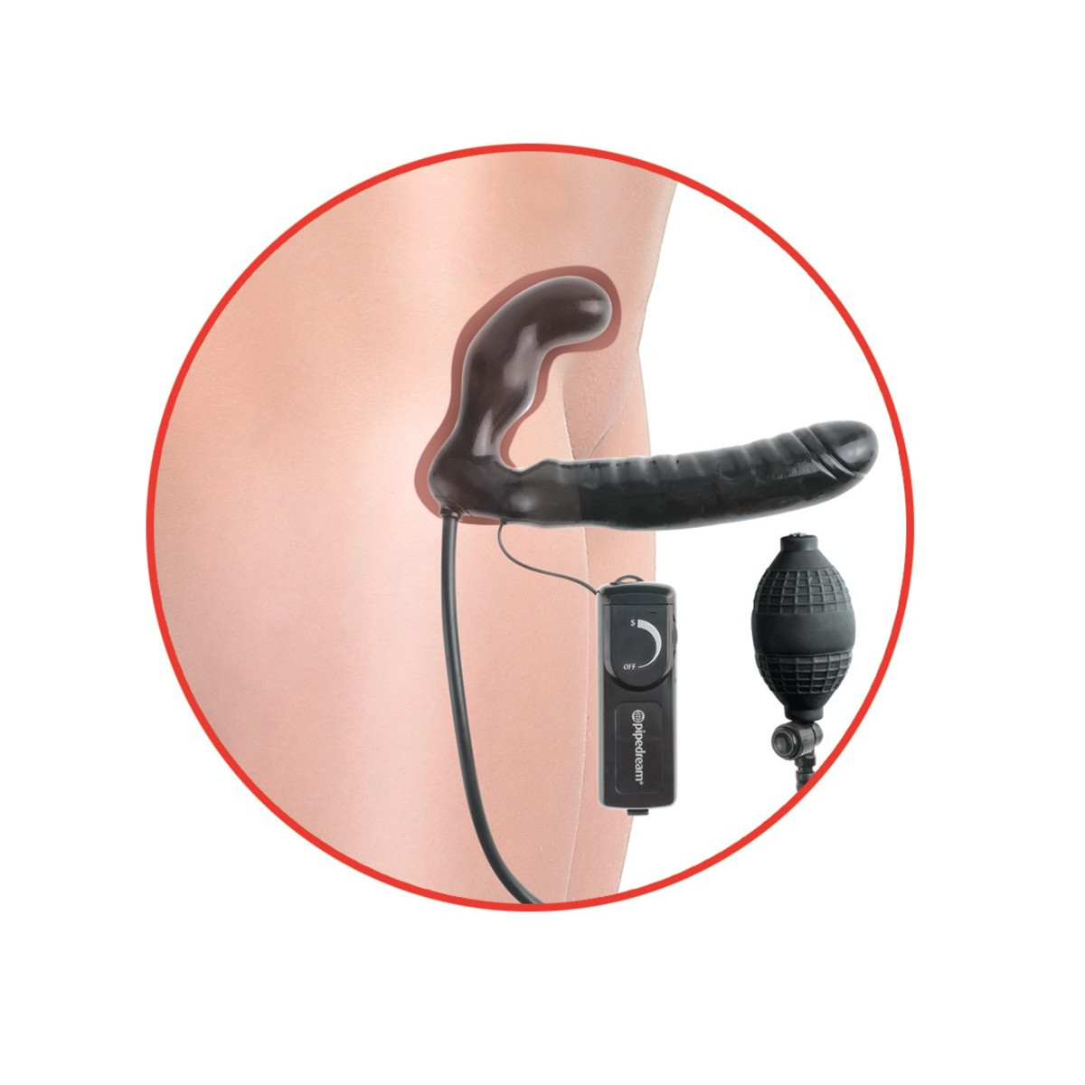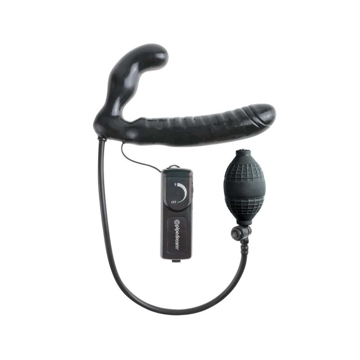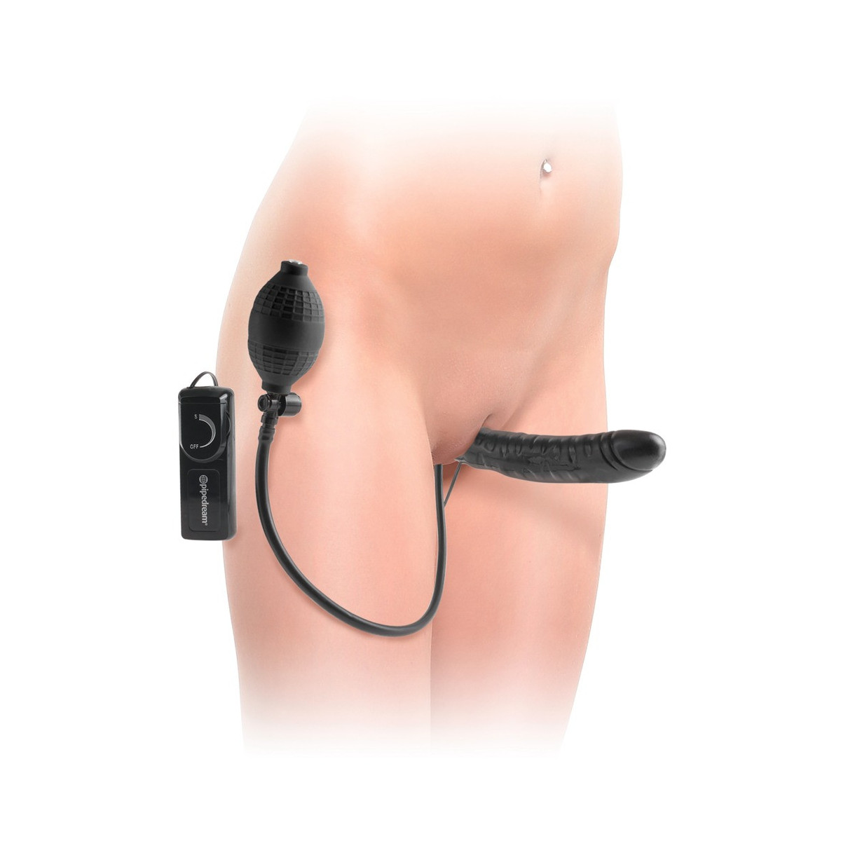 Strapless strap-on con doppio dildo, vibrazione e funzione pompa. Il dildo corto viene inserito nella vagina (o nell'ano) e tenuto dai muscoli vaginali (o anali). Il dildo viene poi pompato con la pompa a sfera per garantire una maggiore aderenza e una sensazione più piena. Equipaggiato in questo modo, il partner può ora essere coccolato con il dildo naturale più lungo e distintamente venato. Con la vibrazione attivata, il piacere diventa ancora più intenso. Pompa a sfera con valvola di sicurezza. Vibrazione a più velocità con telecomando a filo per un facile controllo. (Si prega di ordinare le batterie separatamente: 2 x AA)