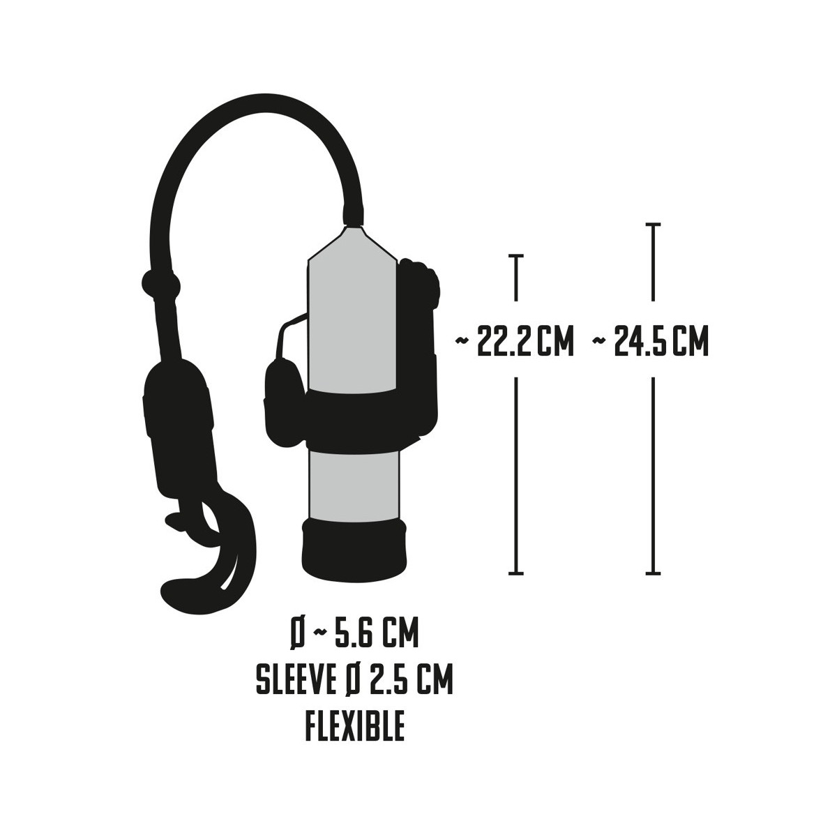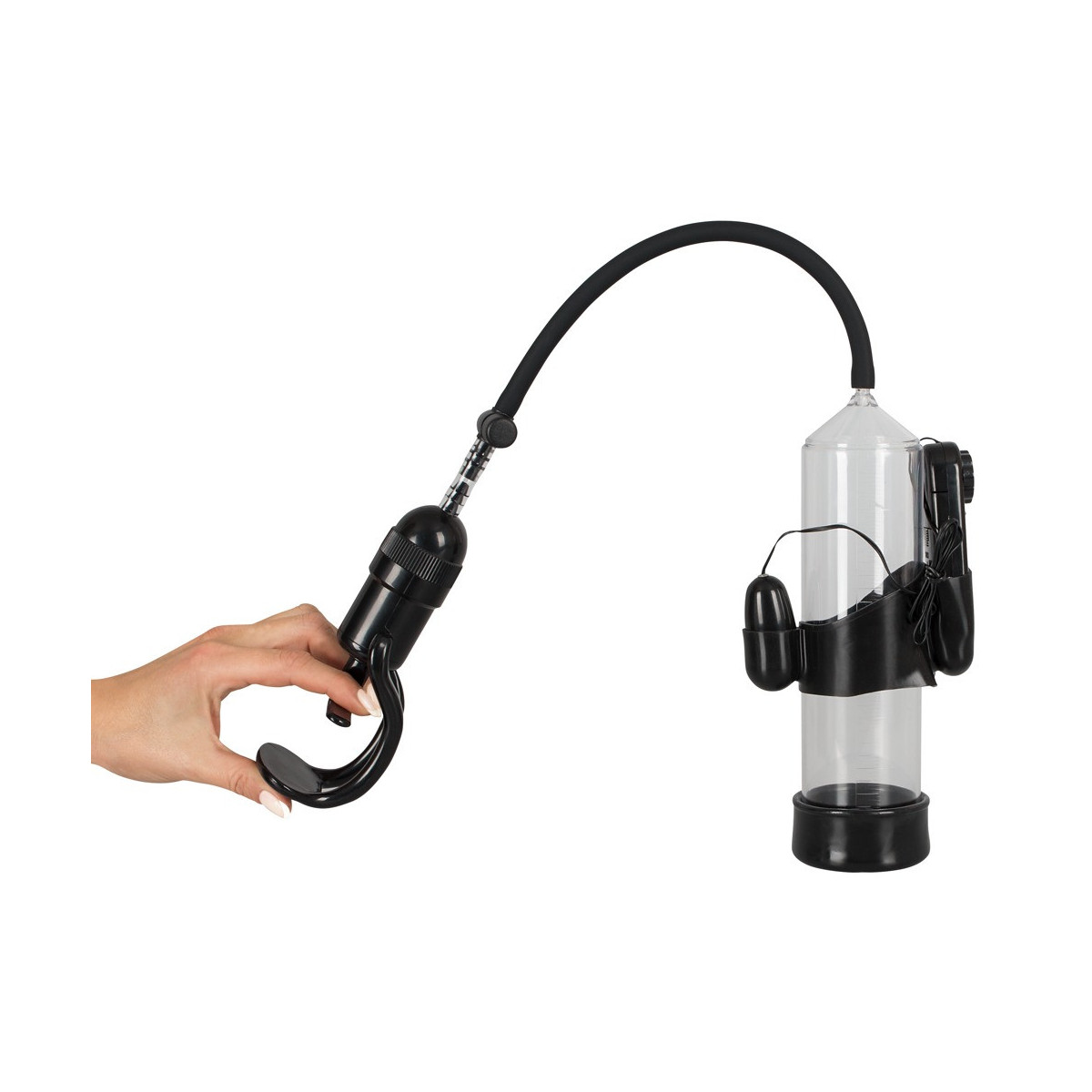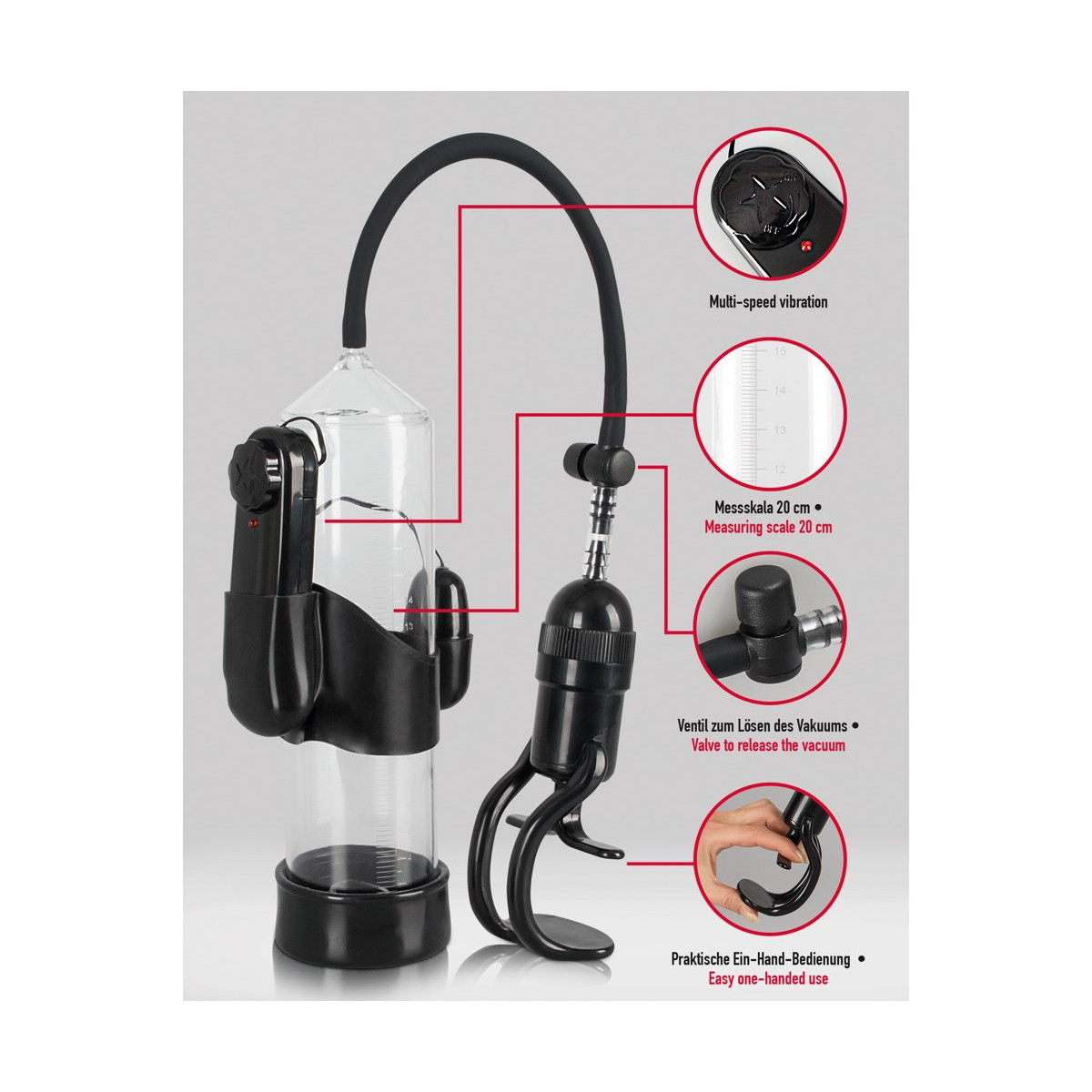 Il pene lubrificato viene inserito nel cilindro trasparente (con scala di misurazione di 20 cm!) e per mezzo della pratica pompa a una mano si crea un vuoto efficace in modo rapido e confortevole, che fa gonfiare il pezzo migliore fino alla sua massima dimensione e forma. Con la vibrazione attivata, l'allenamento è due volte più divertente! Il Vibrobullet per la vibrazione a più velocità può essere rimosso dal manicotto elastico sul cilindro insieme all'unità di controllo e può essere utilizzato anche da solo, ad esempio per i preliminari. Pompa a una mano con valvola di pressione di sicurezza.