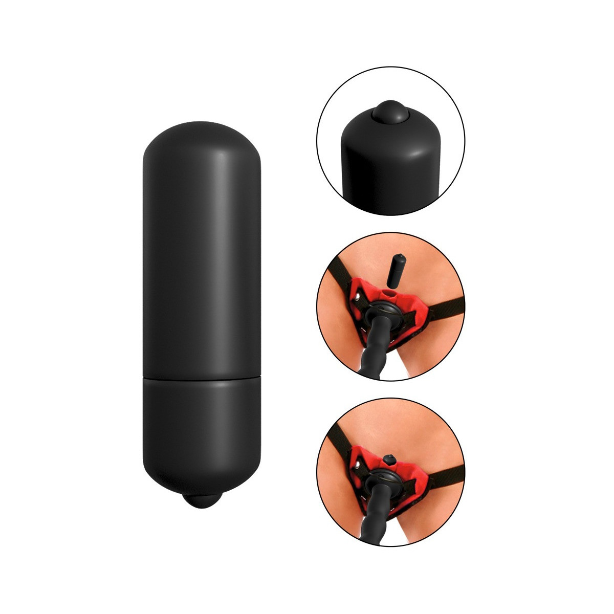 Strap-on con dildo rimovibile e vibrobullet. Per un divertimento illimitato di pegging e la realizzazione dei sogni di spinta lesbica. Dildo con glande extra paffuto e con base di aspirazione - anche da solo e anche giocabile a mani libere. Può essere inserito nella cinghia nella parte anteriore con l'aiuto dell'anello e dei pulsanti - qualsiasi altro dildo/vibratore con una base di aspirazione può anche essere inserito nella cinghia. Il vibrobullet incluso può anche essere posizionato nella parte anteriore della cinghia per una stimolazione extra formicolante. L'imbracatura strap-on è regolabile per una vestibilità antiscivolo.