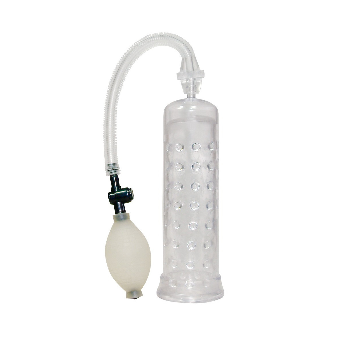 La pompa trasparente con rilievi di stimolazione per un training di piacere, che può ingrandire e rafforzare LUI. Lunghezza complessiva cilindro di pompaggio ca. 19,5 cm, Ø 4,5 cm. Materiale: PVC, ABS, TPE.