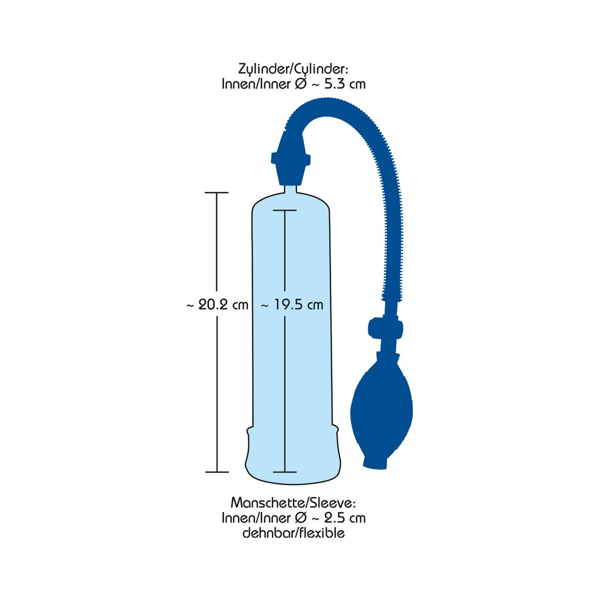 Questa pompa per pene/di potenza con la classica e maneggevole pompa può mettere il vostro pene in forma smagliante! Lunghezza complessiva cilindro di pompaggio ca. 20 cm, Ø 5,7 cm. Blu. Materiale: ABS, PVC, TPE, SAN.