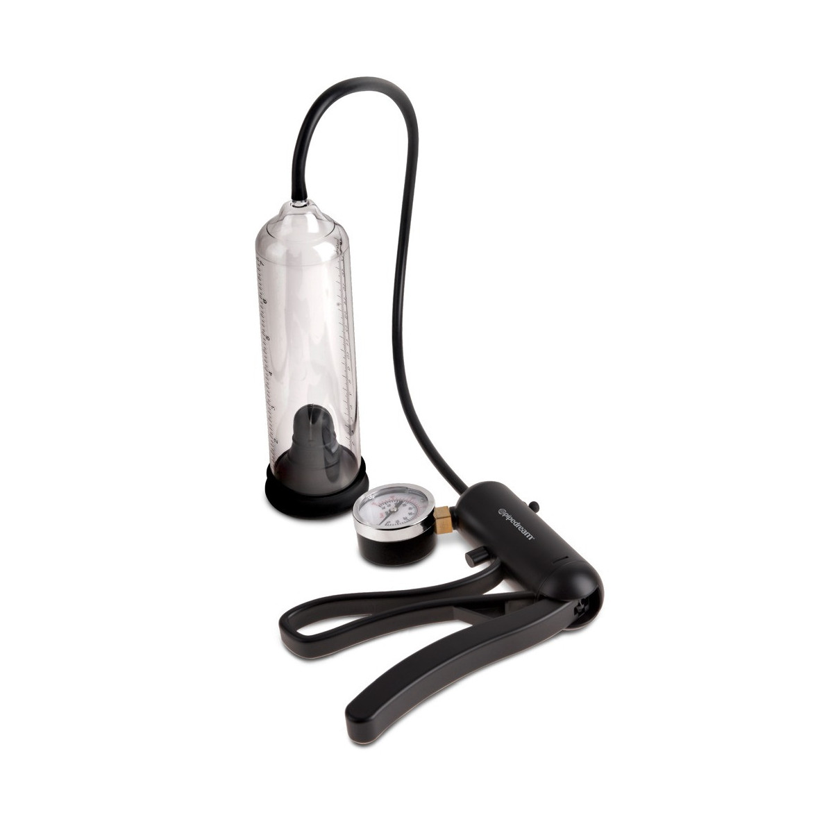 Pompa per il pene con comoda pompa con impugnatura a forbice e manometro per un vuoto di potenza extra forte. Con valvola di pressione per il controllo del vuoto. Polsino meravigliosamente stretto. Un allenamento regolare può rendere il pene permanentemente più forte e più lungo.