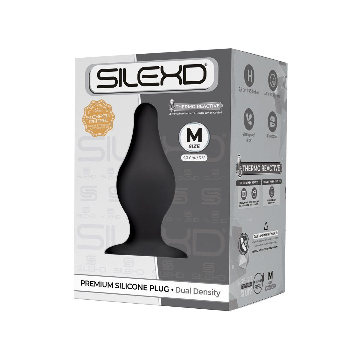Questo Premium Silicone Plug Model 2 M di SilexD con un tappo di base leggermente assorbente si adatta a chi lo indossa. Alle alte temperature diventa morbido e può essere deformato. Questo può essere ottenuto usando un microonde (max. 30 secondi) o acqua calda (max. 2 minuti). Nel frigorifero, invece, la spina diventa dura. Perfettamente adatto alla temperatura e al gioco dei materiali.
