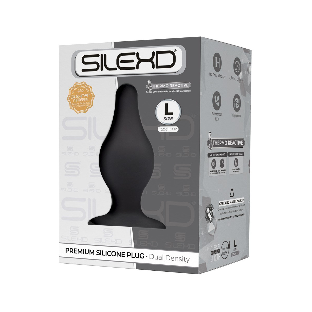 Questo Premium Silicone Plug Model 2 L di SilexD con un tappo leggermente assorbente si adatta a chi lo indossa. Alle alte temperature diventa morbido e può essere deformato. Questo può essere ottenuto usando un microonde (max. 30 secondi) o acqua calda (max. 2 minuti). Nel frigorifero, invece, la spina diventa dura. Perfettamente adatto alla temperatura e al gioco dei materiali.