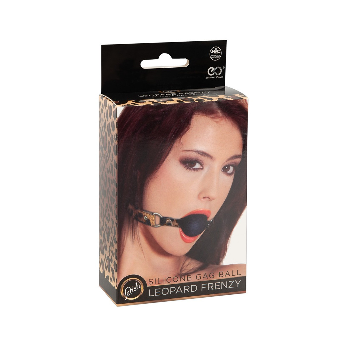 Gag di Leopard Frenzy (Excellent Power). Bavaglio nero rotondo in silicone (Ø 4 cm) su cinghia leo-look, regolabile in circonferenza da 14 cm a 21 cm con chiusura a fibbia.