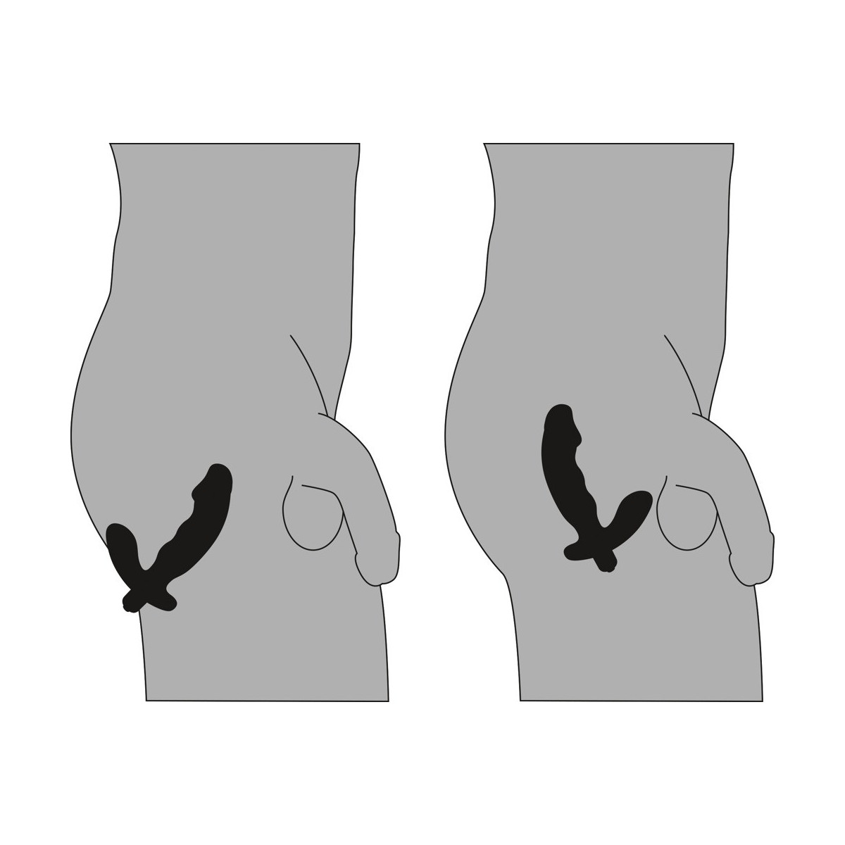 Questo vibratore nero con albero leggermente ondulato e glande paffuto come punteggi punta con stimolatore perineale aggiuntivo.