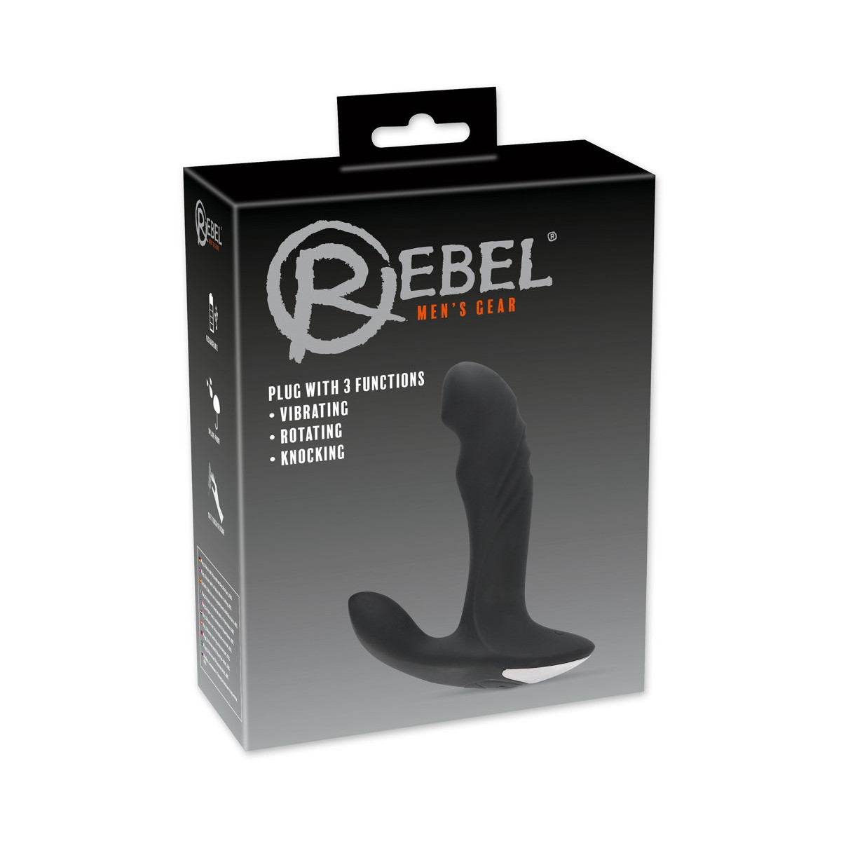 Il plug con 3 funzioni Rebel con riduttore del perineo, albero scanalato e ispessimento sotto la punta leggermente ricurva, coccola con 3 funzioni di formicolio che possono essere controllate separatamente: 7 modalità di vibrazione sono nel riduttore del perineo, 5 modalità di picchiettamento nella punta e 5 modalità di rotazione sono in attesa nell'albero inferiore.