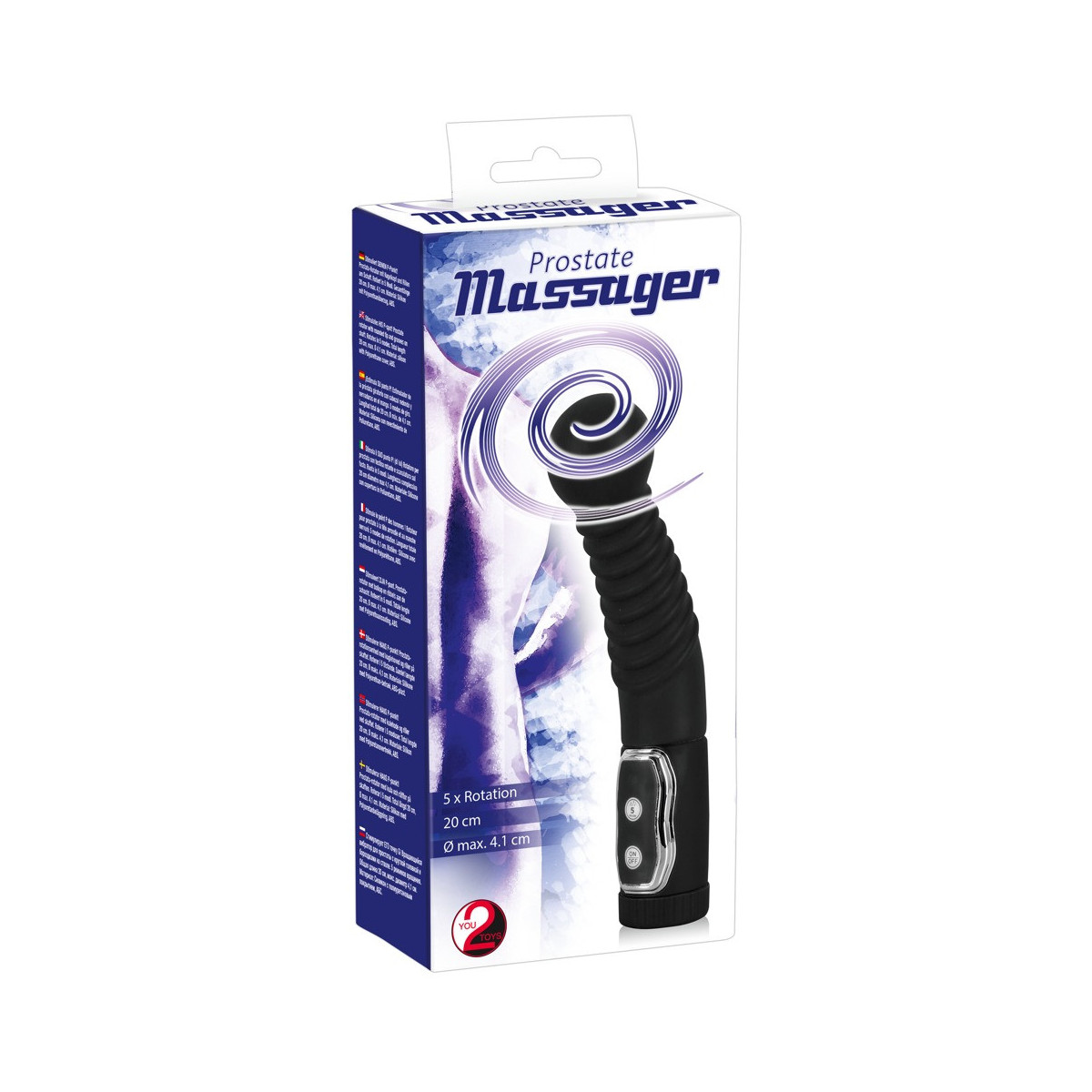 Rotatore prostatico con testa sferica e albero scanalato. 5 modalità di rotazione. Lunghezza totale 20 cm, Ø max. 4,1 cm. Silicone con rivestimento in PU, ABS. Si prega di ordinare le batterie separatamente: 4 x AAA.