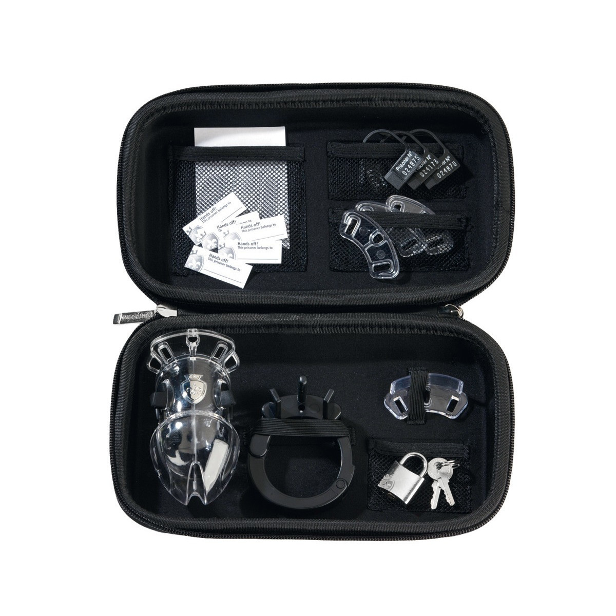 Gabbia per pene in solido silicone con morsetto, disco di fissaggio, tre distanziatori, serratura metallica con due chiavi, cavo per elettrodi, cinque guarnizioni in plastica e dieci piastre di proprietà. Lunghezza totale da 8,2 a 9,4 cm. Ø da 3,4 a 4,7 cm. Materiale: silicone, PC, ABS. Nota: Accessori per le unità di corrente di stimolazione Tension Lover (0528927 0000) e Pure Vibes (0529761 0000).