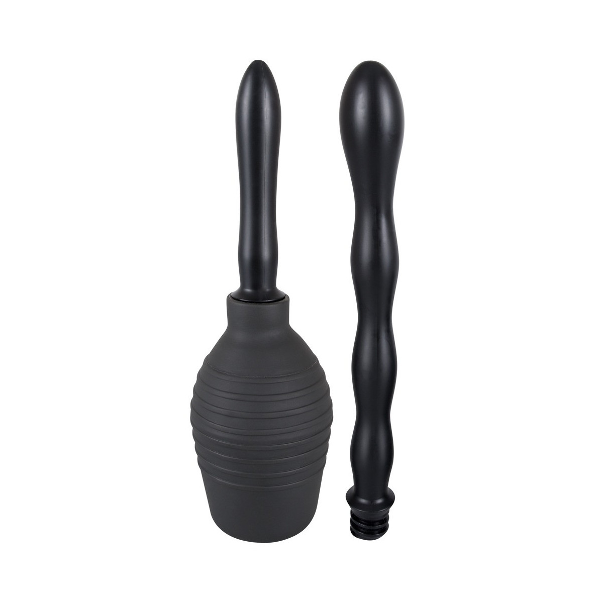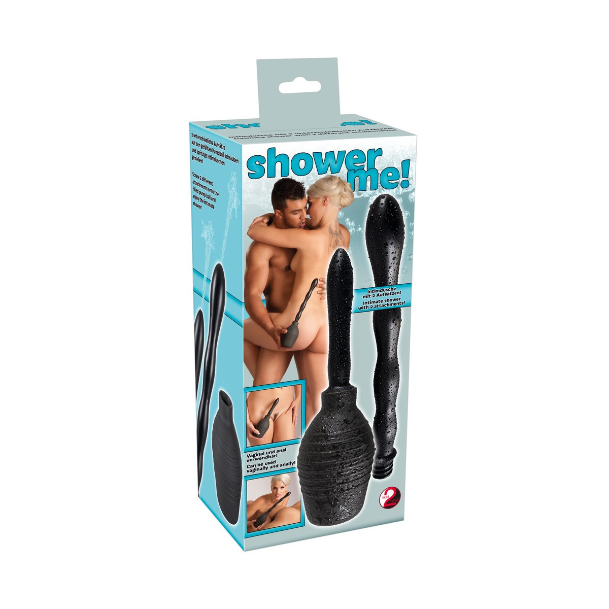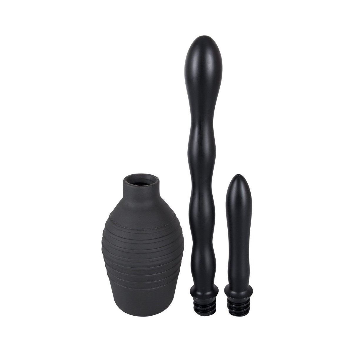 Doccia intima nera (altezza 13 cm, capacità 300 ml) con due attacchi intercambiabili a vite con ugelli a spruzzo. Facile da pulire. Attacco lungo e ondulato: lunghezza totale ca. 23 cm, Ø 1,7-3 cm. Attacco corto e liscio: ca. 11,5 cm di lunghezza Ø 1,9-2,3 cm). Materiale: PVC.