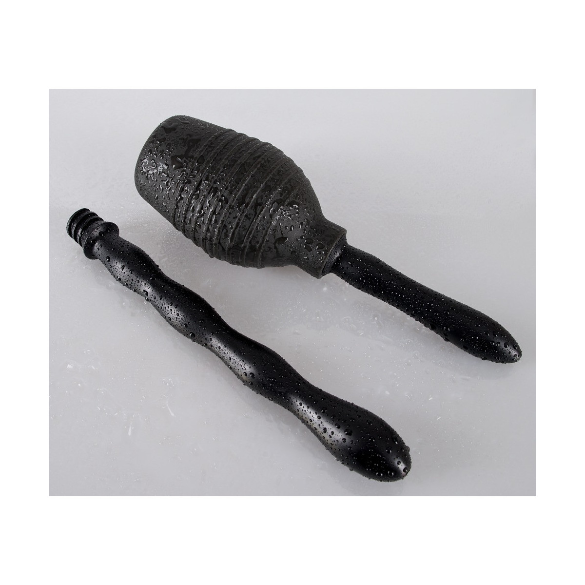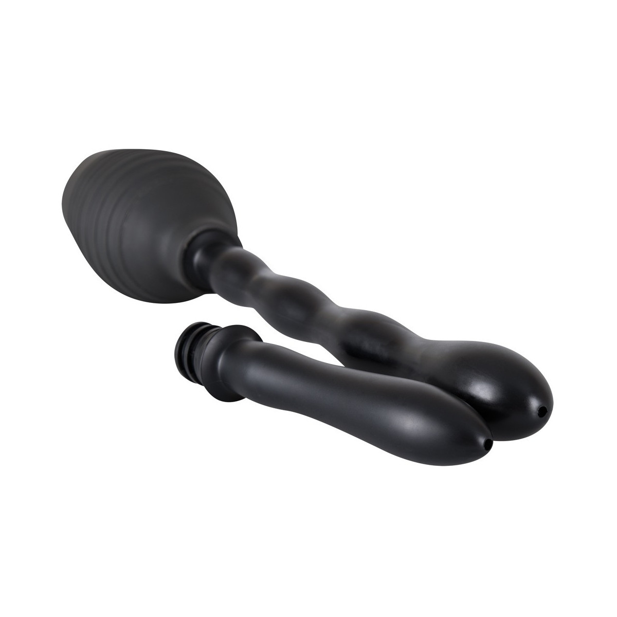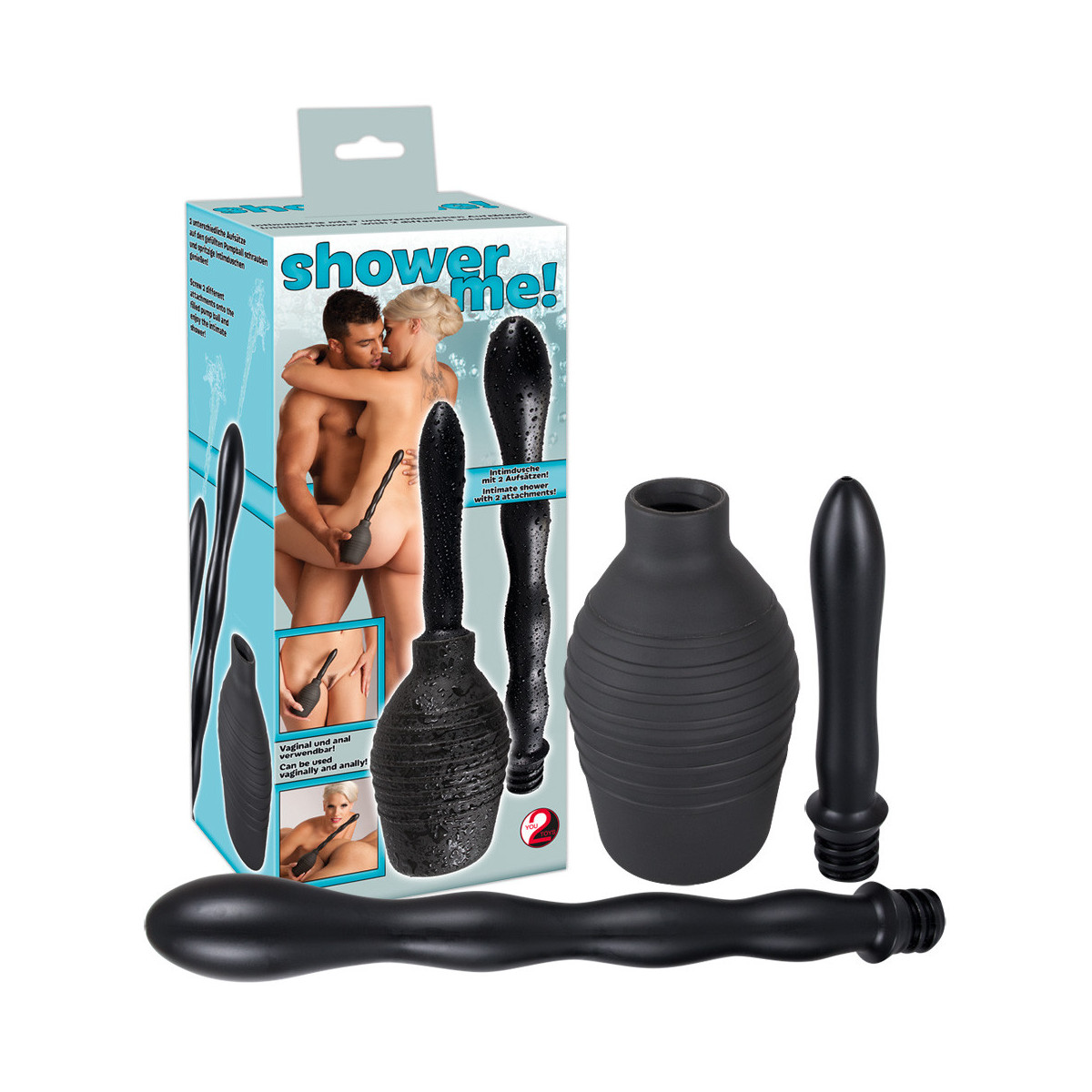 Doccia intima nera (altezza 13 cm, capacità 300 ml) con due attacchi intercambiabili a vite con ugelli a spruzzo. Facile da pulire. Attacco lungo e ondulato: lunghezza totale ca. 23 cm, Ø 1,7-3 cm. Attacco corto e liscio: ca. 11,5 cm di lunghezza Ø 1,9-2,3 cm). Materiale: PVC.