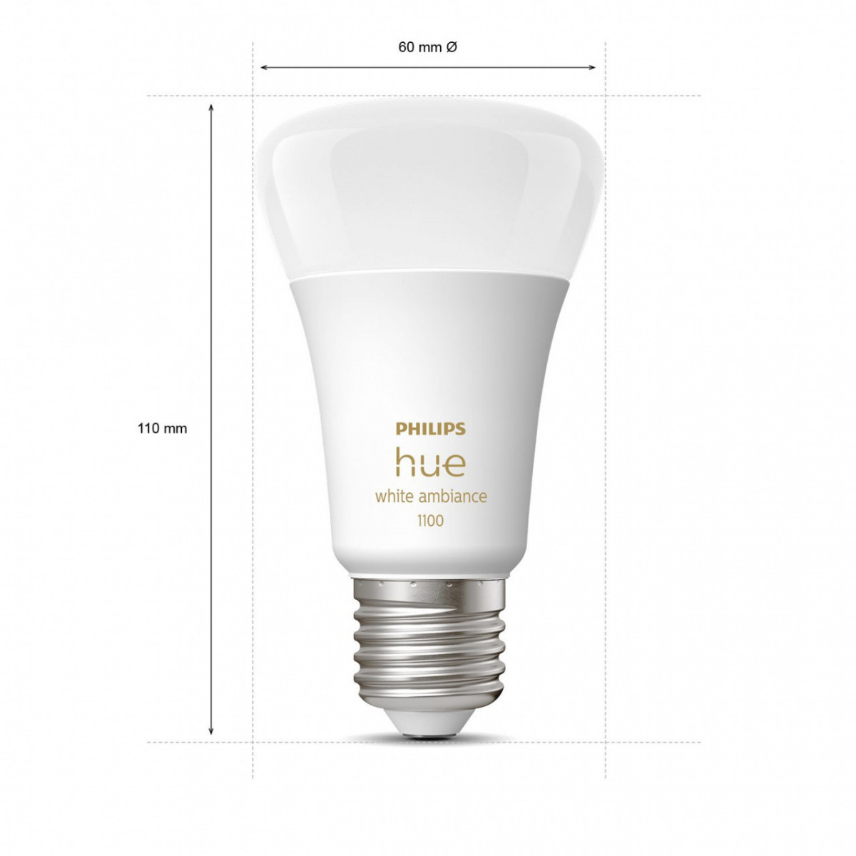 Philips Hue White ambiance 2 Lampadine Smart E27 75 W. Tipo: Lampadina intelligente, Colore del prodotto: Bianco, Interfaccia: Bluetooth/Zigbee. Classe efficienza energetica: F, Consumi (modalità stand-by): 0,5 W, Consumo energetico (max): 8 W. Larghezza: 110 mm, Profondità: 110 mm, Altezza: 110 mm. Tipo di imballo: Scatola, Profondità imballo: 72 mm. Quantità per pacco: 2 pz, Numero di lampadine hue incluse: 2 lampadina(e)