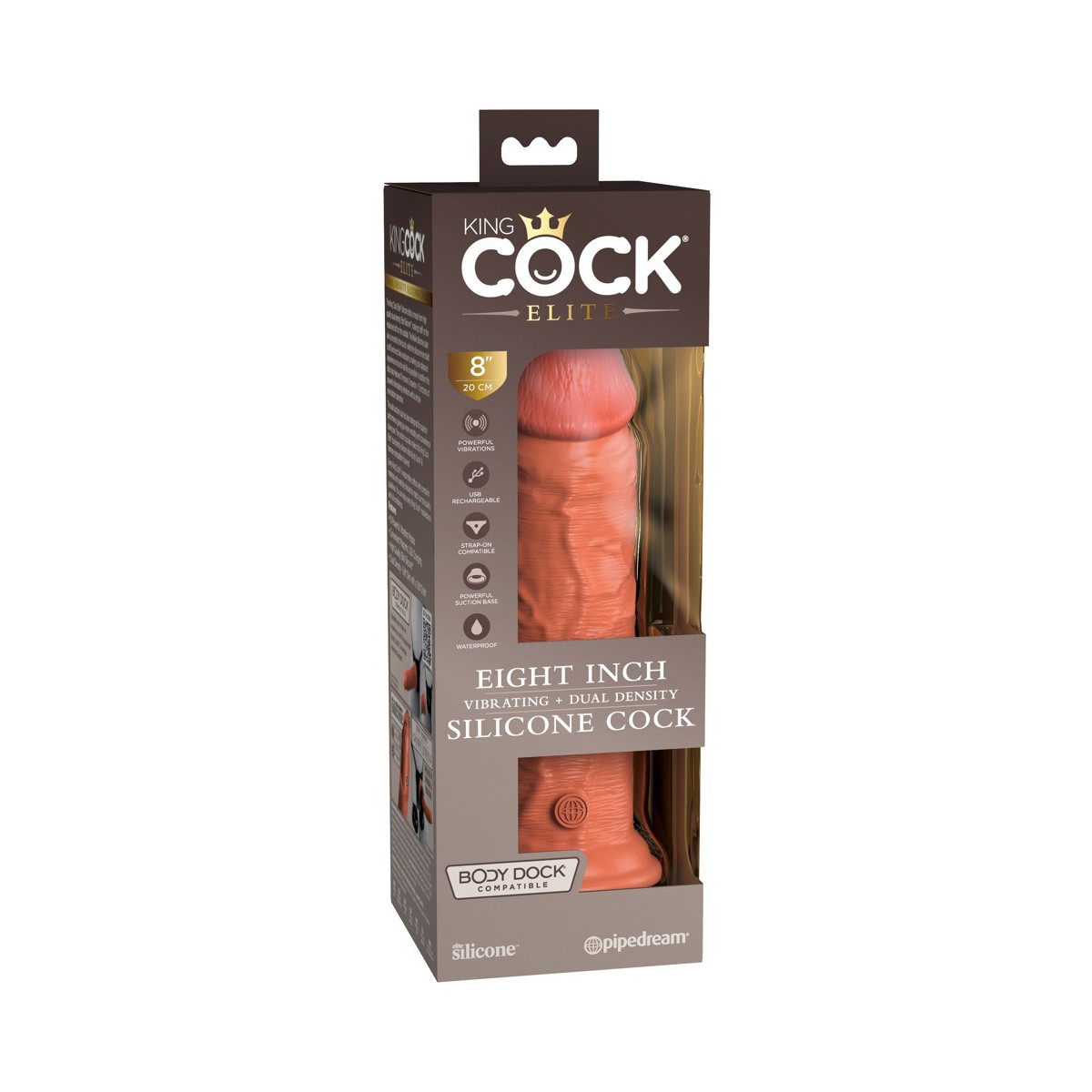 Vibratore naturale ricaricabile 8" vibrante + Dual Density Silicone Cock di King Cock Elite in look iper-realistico del pene fatto di materiale siliconico a doppia densità che si sente come la vera pelle. Il vibratore stesso (come un vero membro eretto) ha un'asta ferma, ma flessibile che rende l'esperienza di piacere il più realistica possibile.