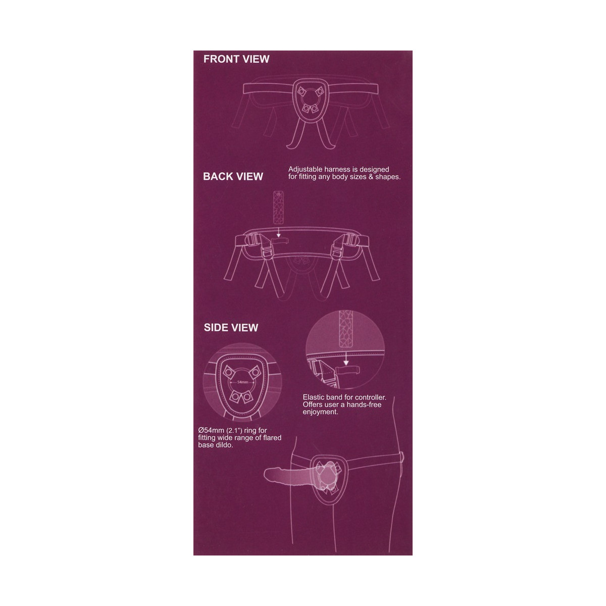 Vibratore: lunghezza totale 19 cm, profondità di inserimento 14 cm, Ø 3,7 cm. Cinturino 63 cm x 132 cm (regolabile). Anello Ø 5,4 cm. Si prega di ordinare le batterie separatamente: 3x AAA/Micro.