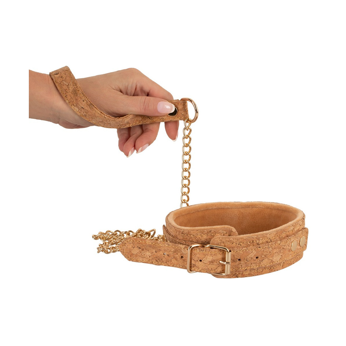 Legame per il collo più guinzaglio da Vegan Fetish in un set. Polsino e cinturino del guinzaglio in sughero naturale con il tipico bell'aspetto, il guinzaglio a catena e gli elementi in metallo sono in color oro lucido. Il collare è foderato all'interno con un peluche chiaro coordinato per un elevato comfort e ha un occhiello rivettato con anello sul davanti per attaccare il guinzaglio in dotazione. Regolabile in circonferenza da 35 cm a 44 cm con chiusura a fibbia. Guinzaglio a catena con moschettone e passante lungo 85 cm.