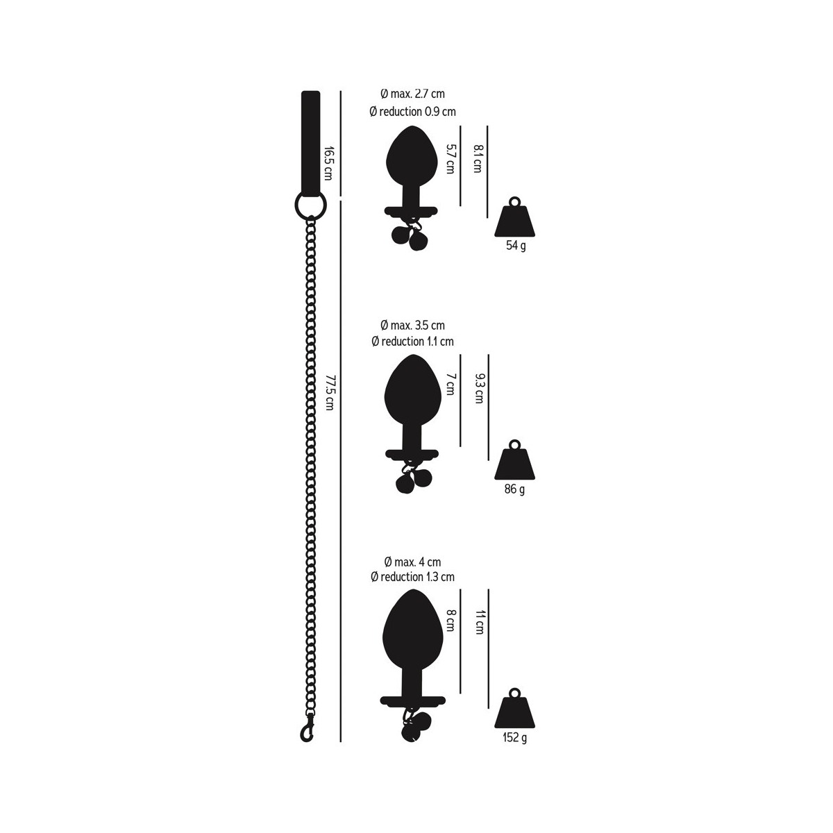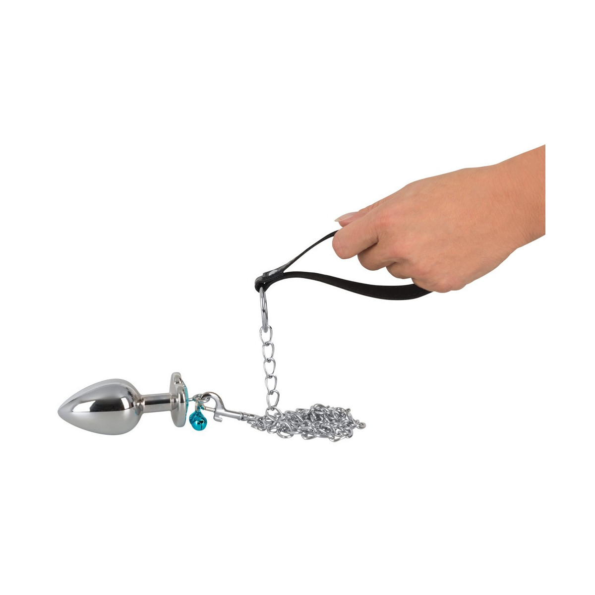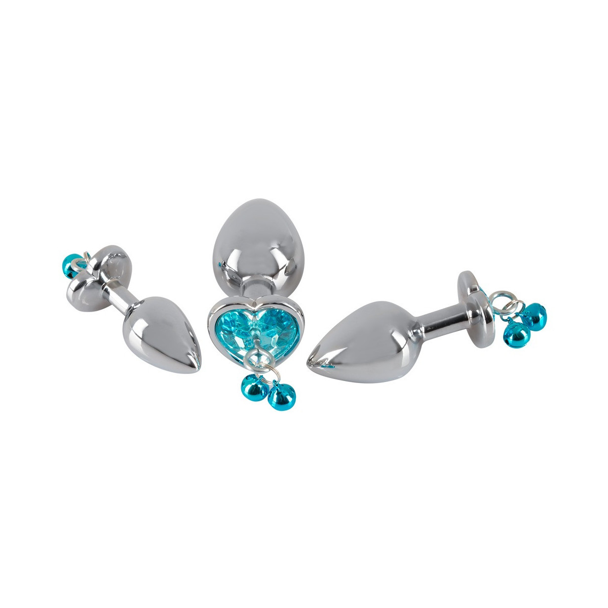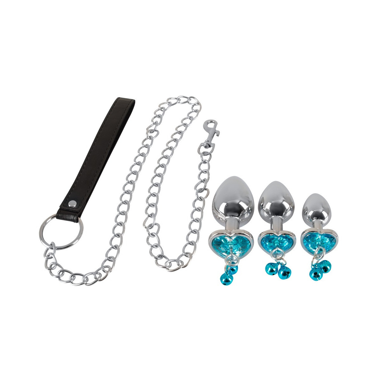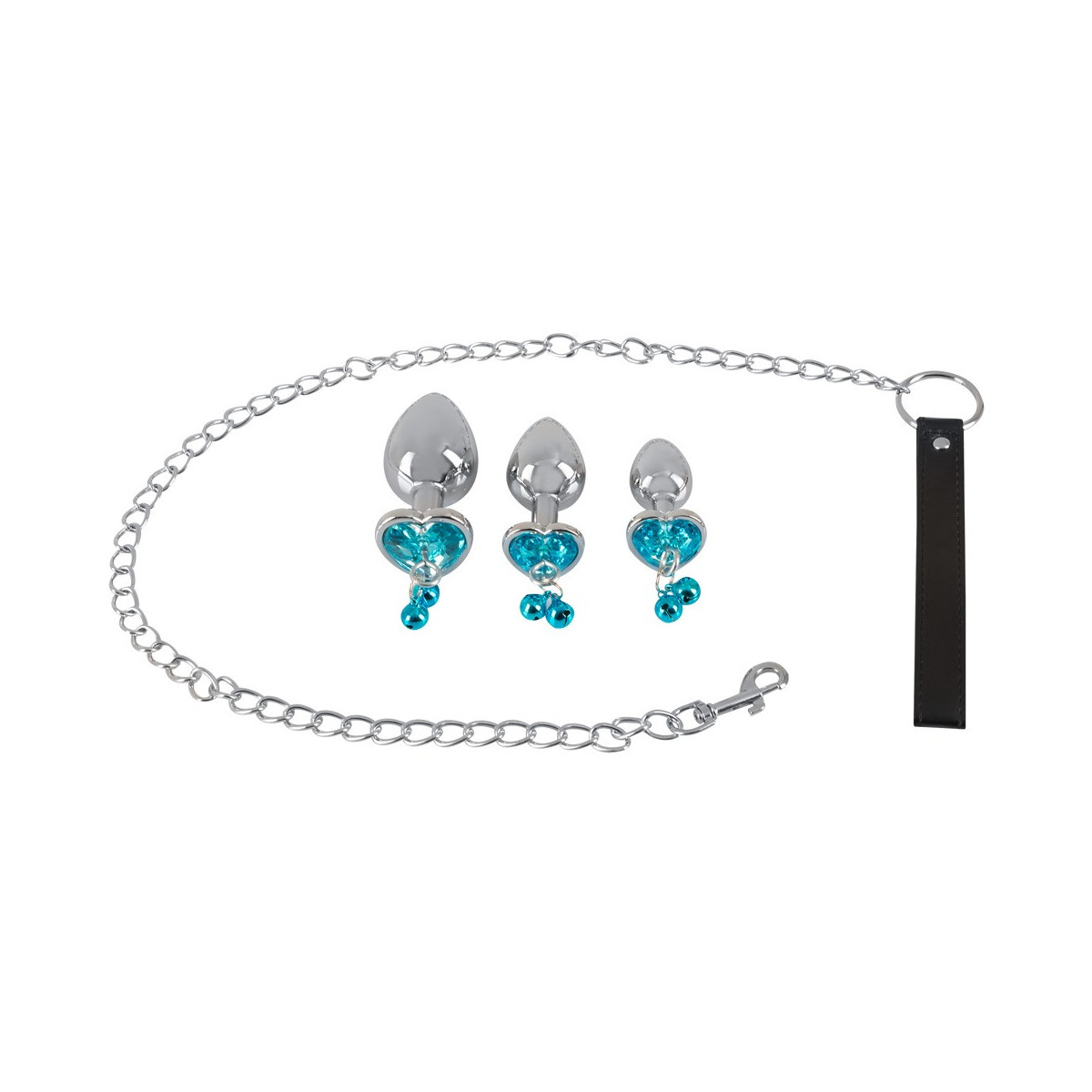 Set di butt plug da 4 pezzi con guinzaglio di You2Toys con 3 plug di diverse dimensioni più guinzaglio a catena. Ogni spina ha un tappo che decora l'ano a forma di cuore, al quale sono attaccati 2 campanelli tintinnanti e un anello. Il guinzaglio a catena incluso con moschettone può essere attaccato all'anello per giochi di controllo e guida. Guinzaglio a catena con cinturino da polso in pelle. I tappi di alluminio possono essere riscaldati in un bagno d'acqua o raffreddati in frigorifero per sensazioni ancora più raffinate.
