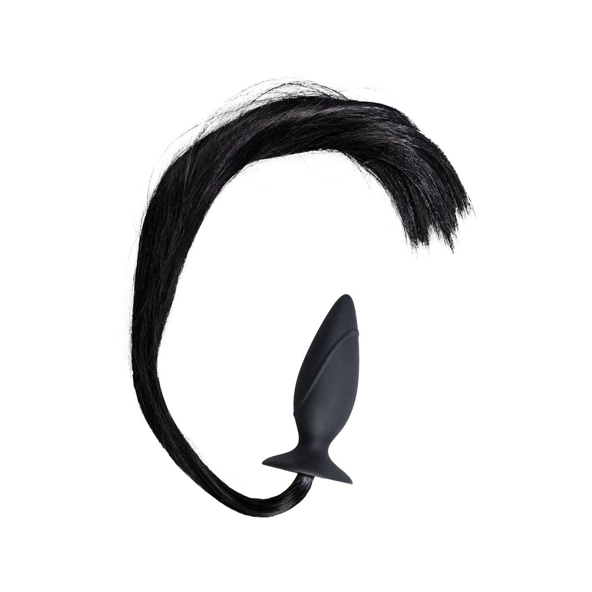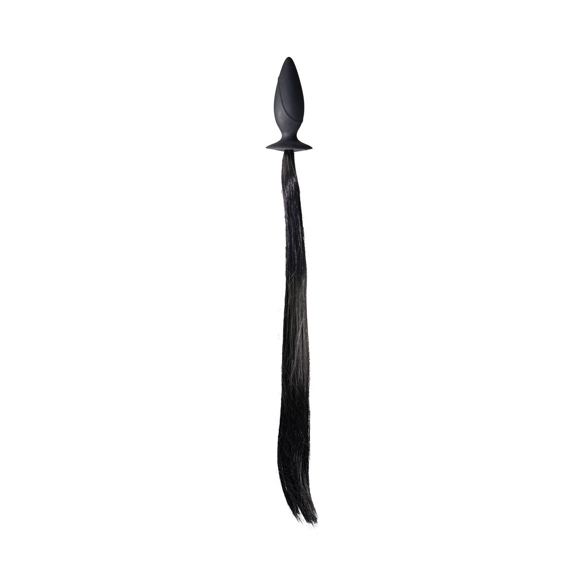 Tappo anale nero con la coda di cavallo. Lunghezza totale spina 12,5 cm, profondità di inserimento 11 cm. Ø 2-4 cm. Coda lunga circa 50 cm. Materiale: silicone, poliestere.