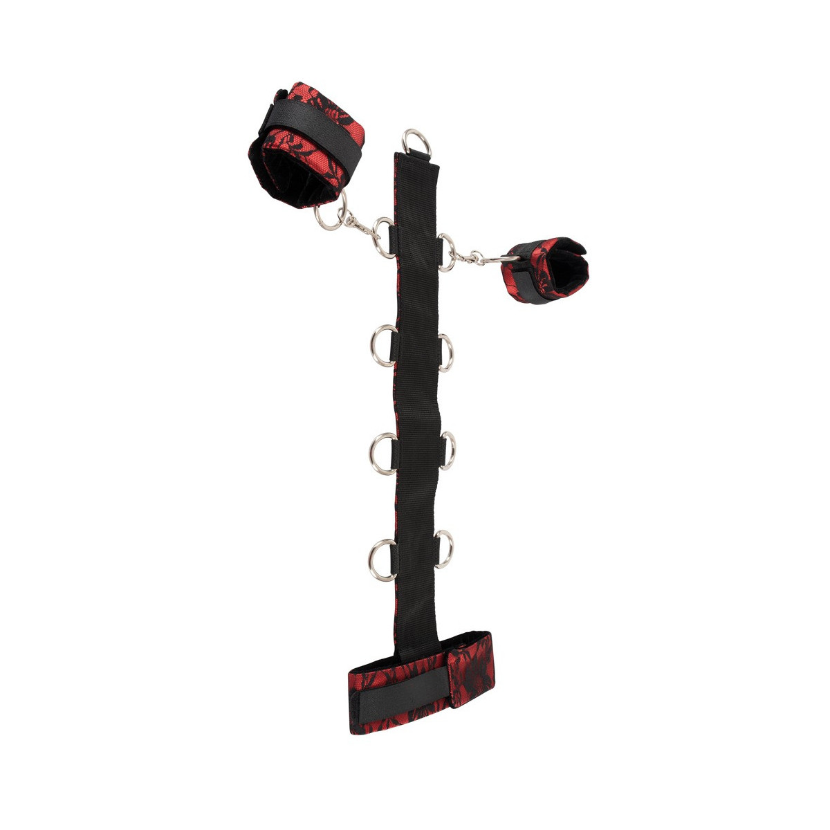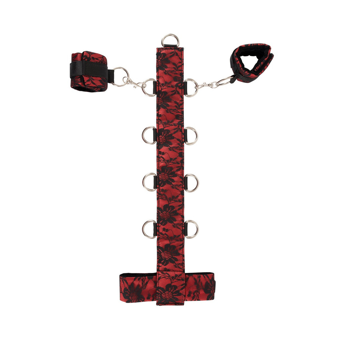 Polsino da collo con barra ad anelli e set di manette con moschettone. Realizzato in sensuale raso rosso e pizzo nero. All'interno in nobile velluto nero. Con chiusure in velcro regolabili individualmente.