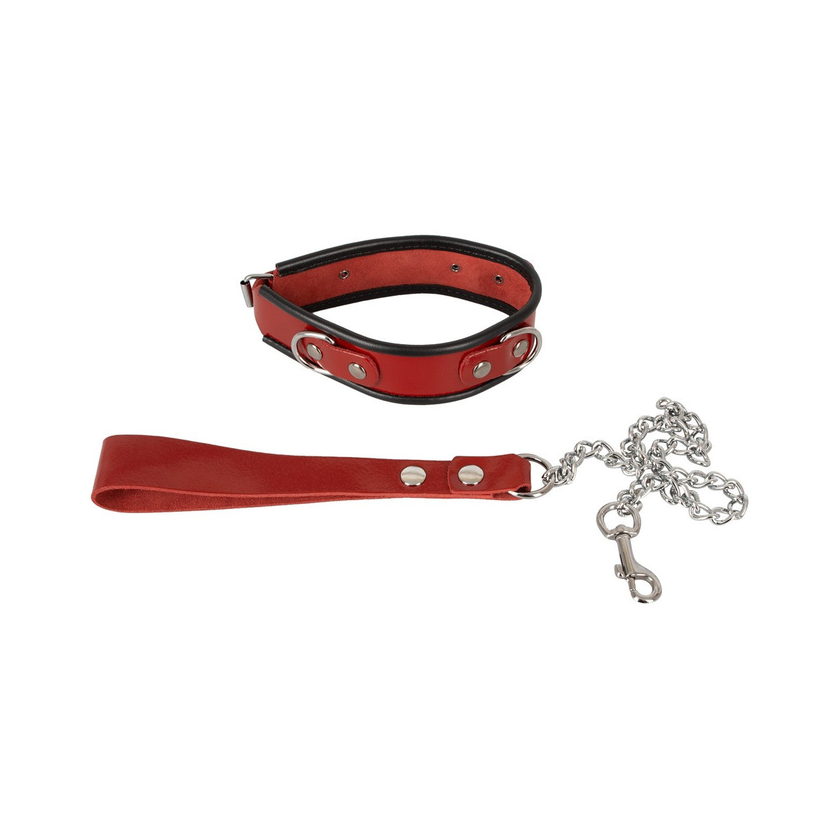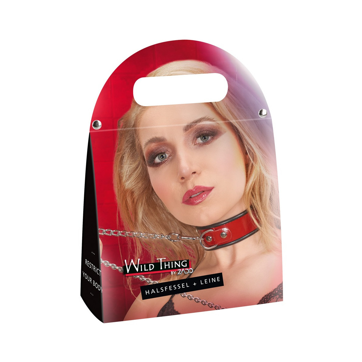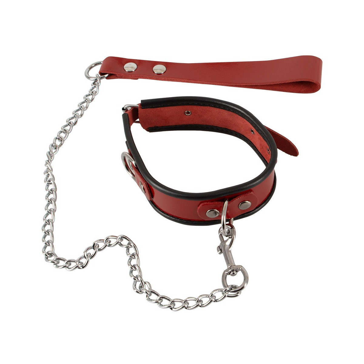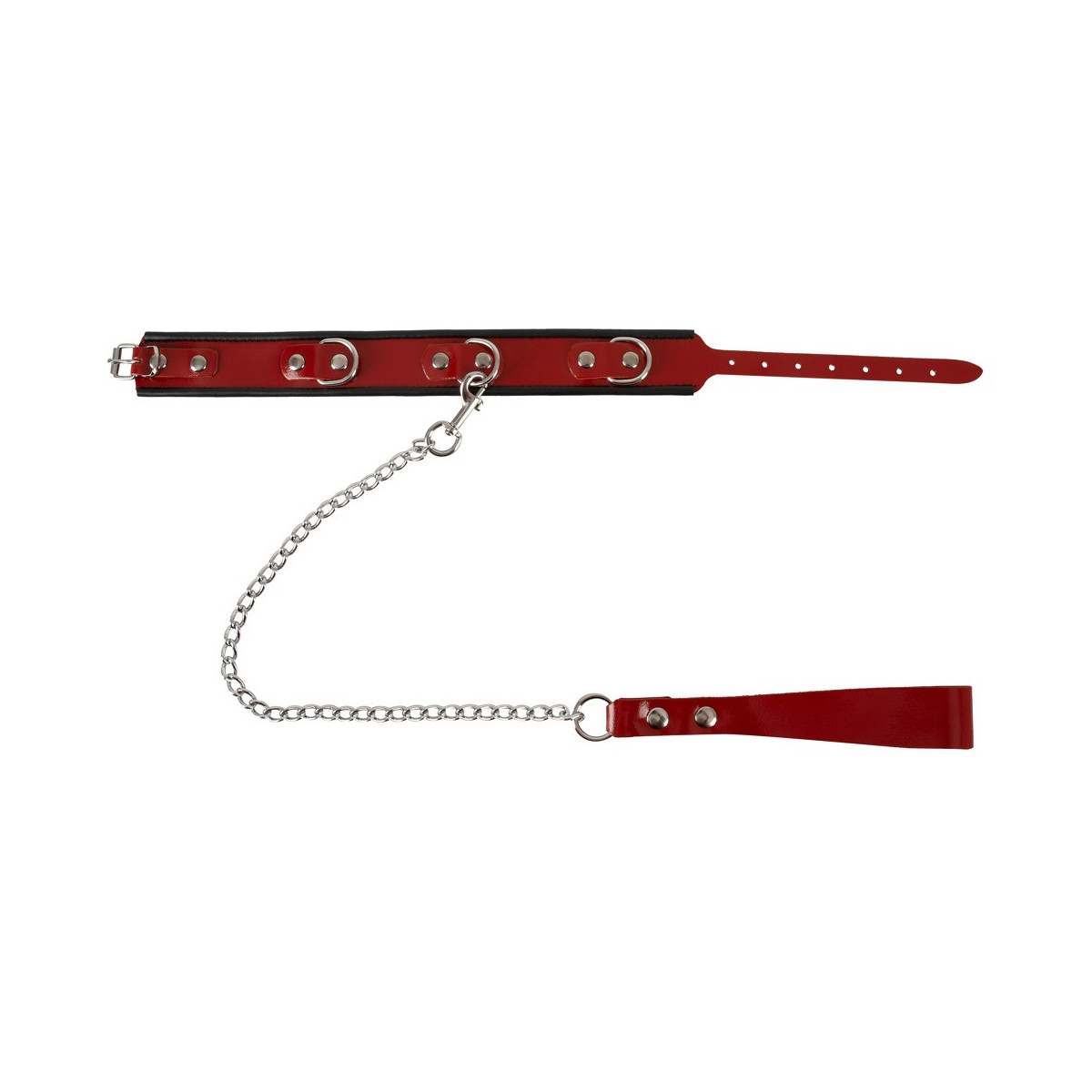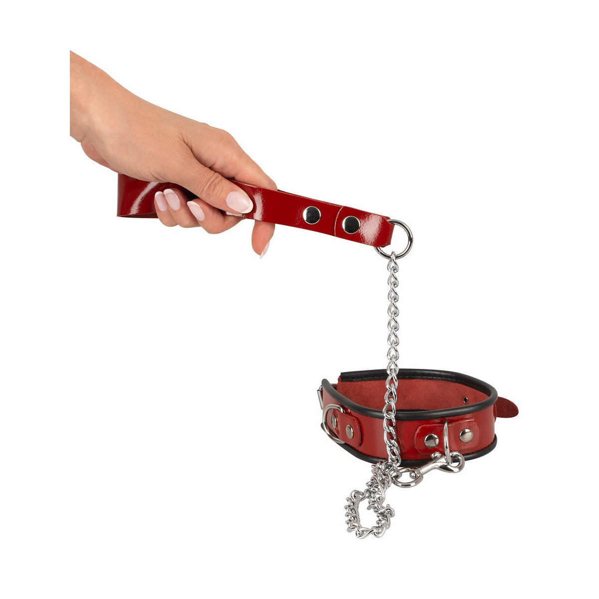Polsino da collo sfoderato in vernice rossa, bordi neri. Davanti e di lato un anello ciascuno per appendere il guinzaglio in dotazione. Con chiusura a fibbia regolabile in circonferenza da 34 cm a 44 cm. Guinzaglio a catena con moschettone e passante in vernice lungo 85 cm.