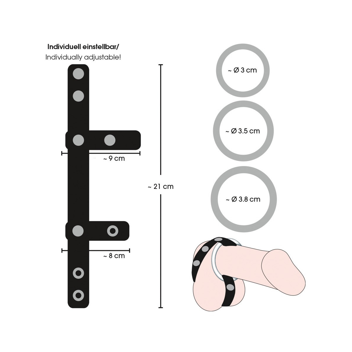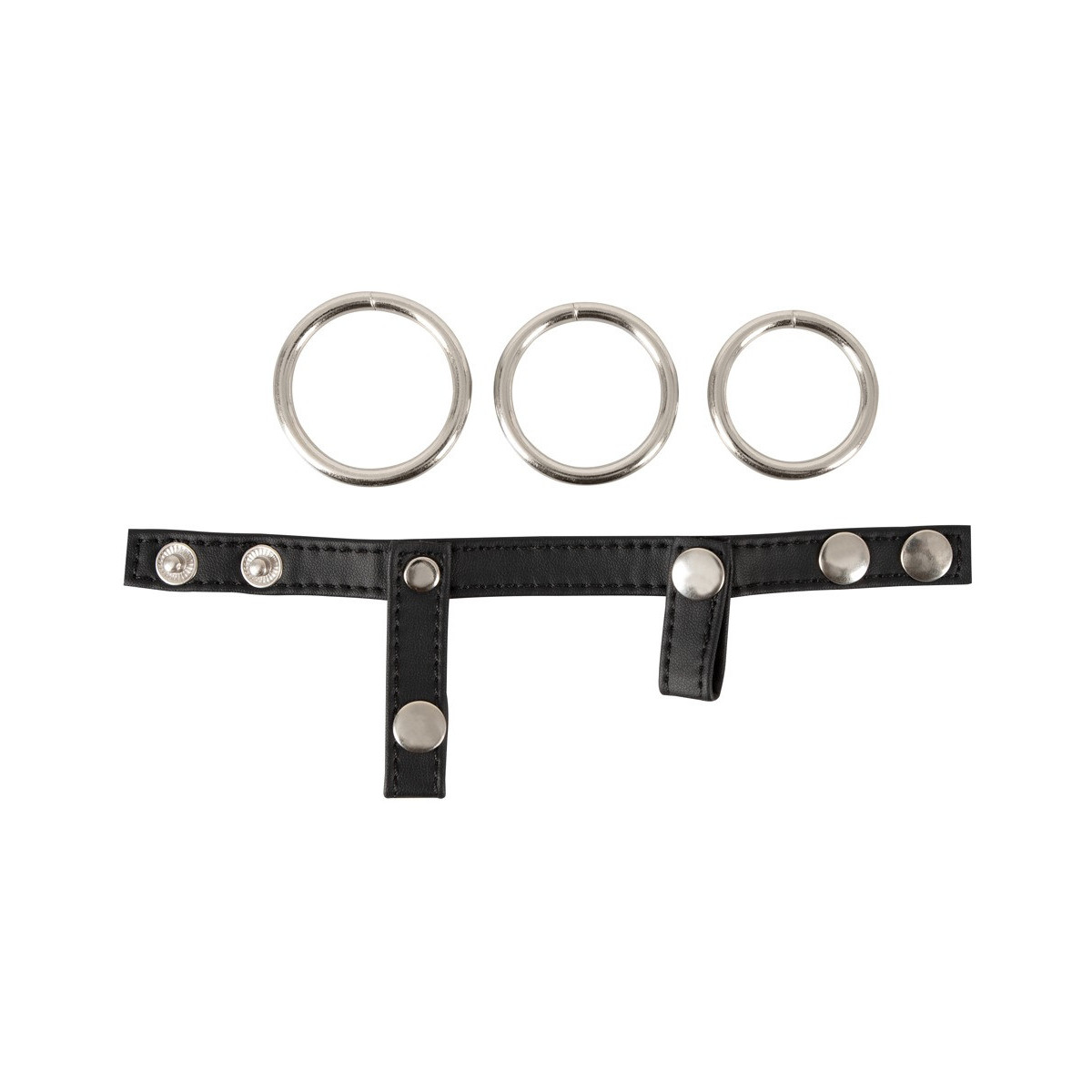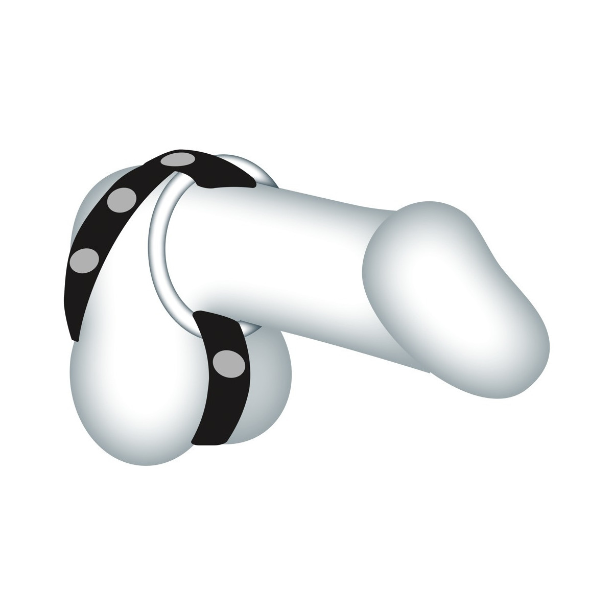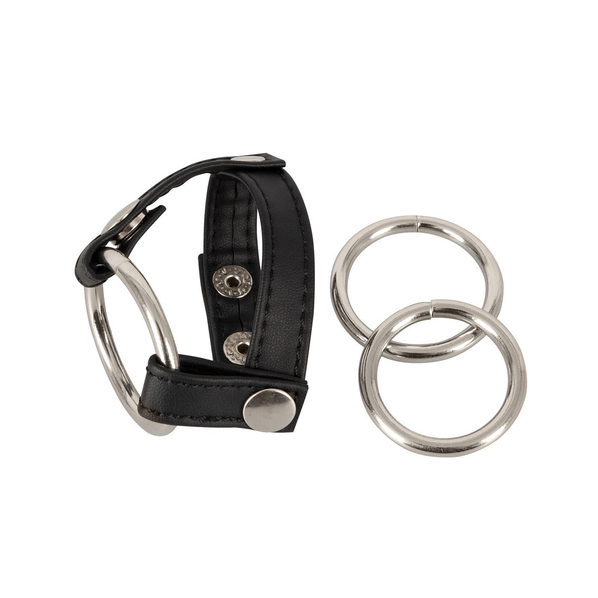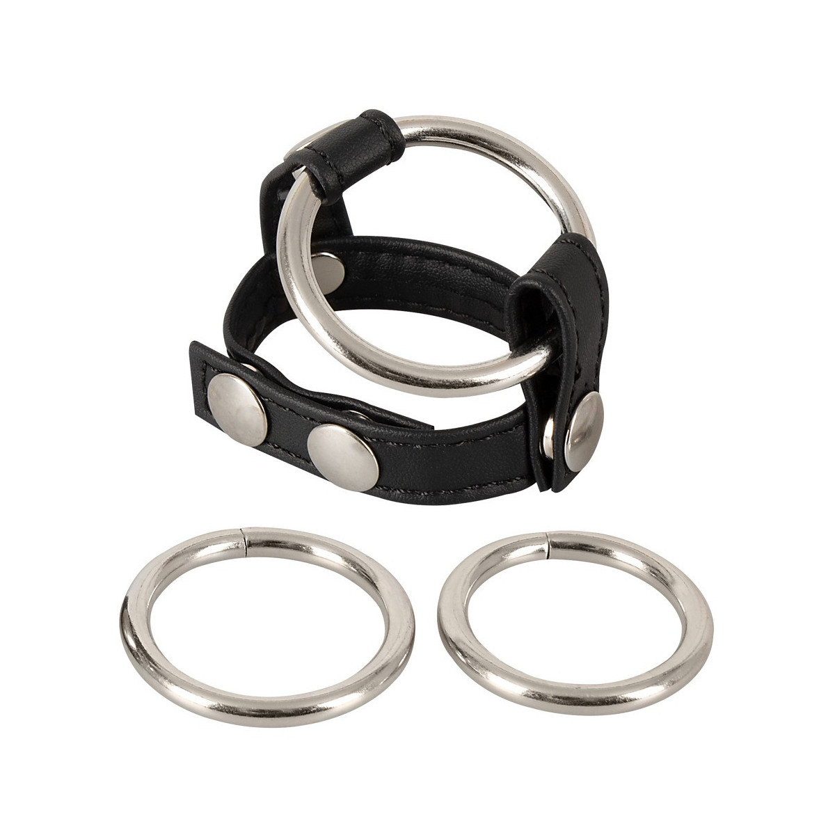 Cinghia di pelle regolabile con borchie decorative e tra anelli per pene metallici sostituibili: Ø 3 cm, Ø 3,5 cm e Ø 4 cm. Nero/argento. Materiale: pelle crosta, metallo.